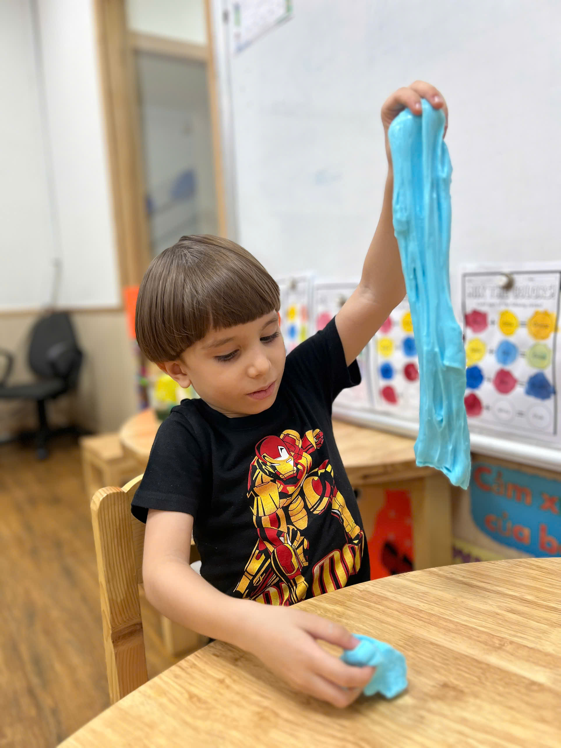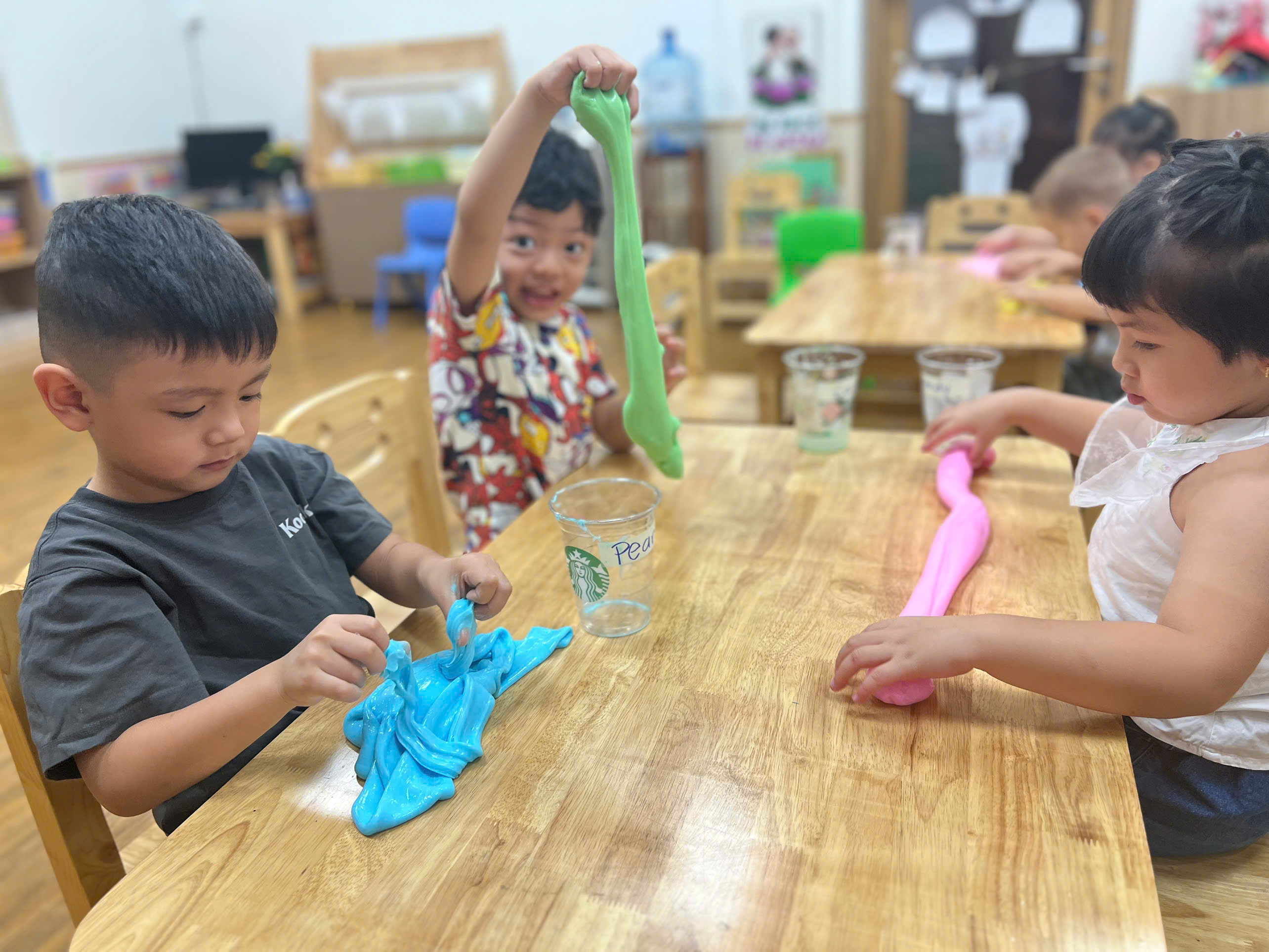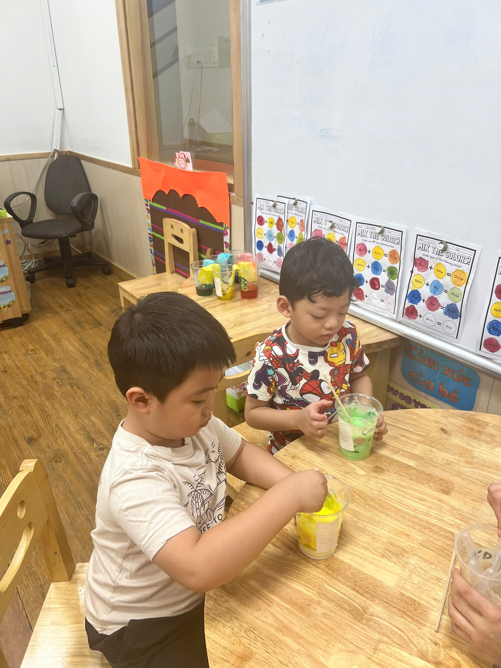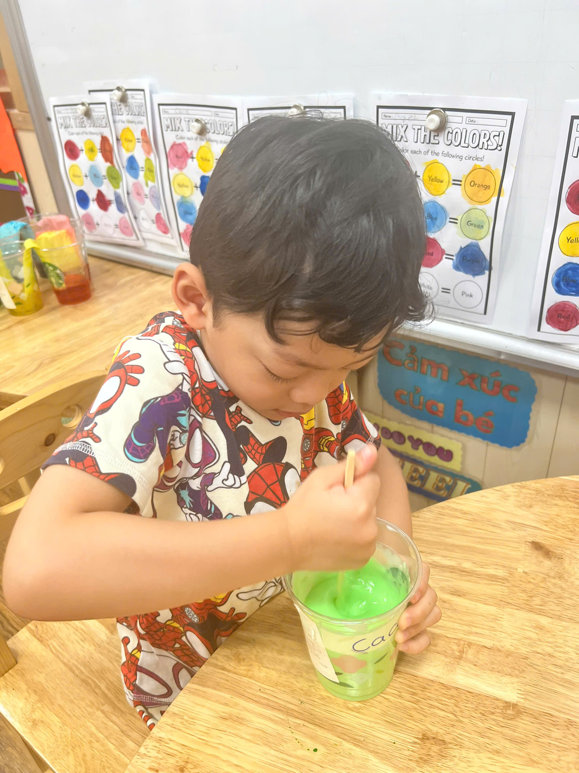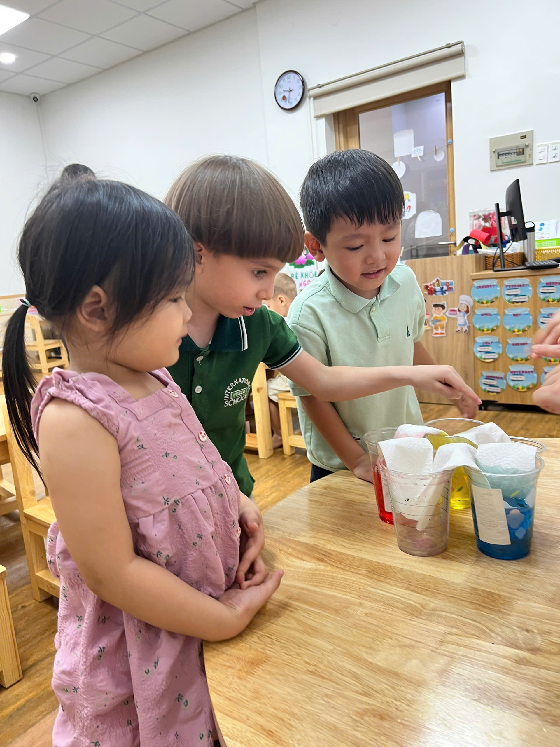 Các em đã thử thách kỹ năng dự đoán của mình bằng cách đoán xem chúng sẽ tạo ra màu mới nào khi trộn hai màu khác với nhau 🎨 Sự tò mò của các em được khơi dậy thông qua các hoạt động thực hành như Thí nghiệm Bước đi Cầu vồng, nơi các em vô cùng kinh ngạc khi chứng kiến các màu cơ bản di chuyển một cách kỳ diệu từ cốc này sang cốc khác và một màu mới xuất hiện 🌈 Các em cũng được khám phá các phản ứng hóa học và các kết cấu khác nhau bằng cách làm Slime 👨🔬 👩🔬. Để rèn luyện kỹ năng quan sát, các em đã thích thú phân loại những quả cầu lông nhiều màu sắc và ghép chúng vào đúng cốc màu. Đó là một tuần tràn ngập sự ngạc nhiên, khám phá và rất nhiều bài học đầy màu sắc và thú vị! 🥽🥼🧤🧪🌈