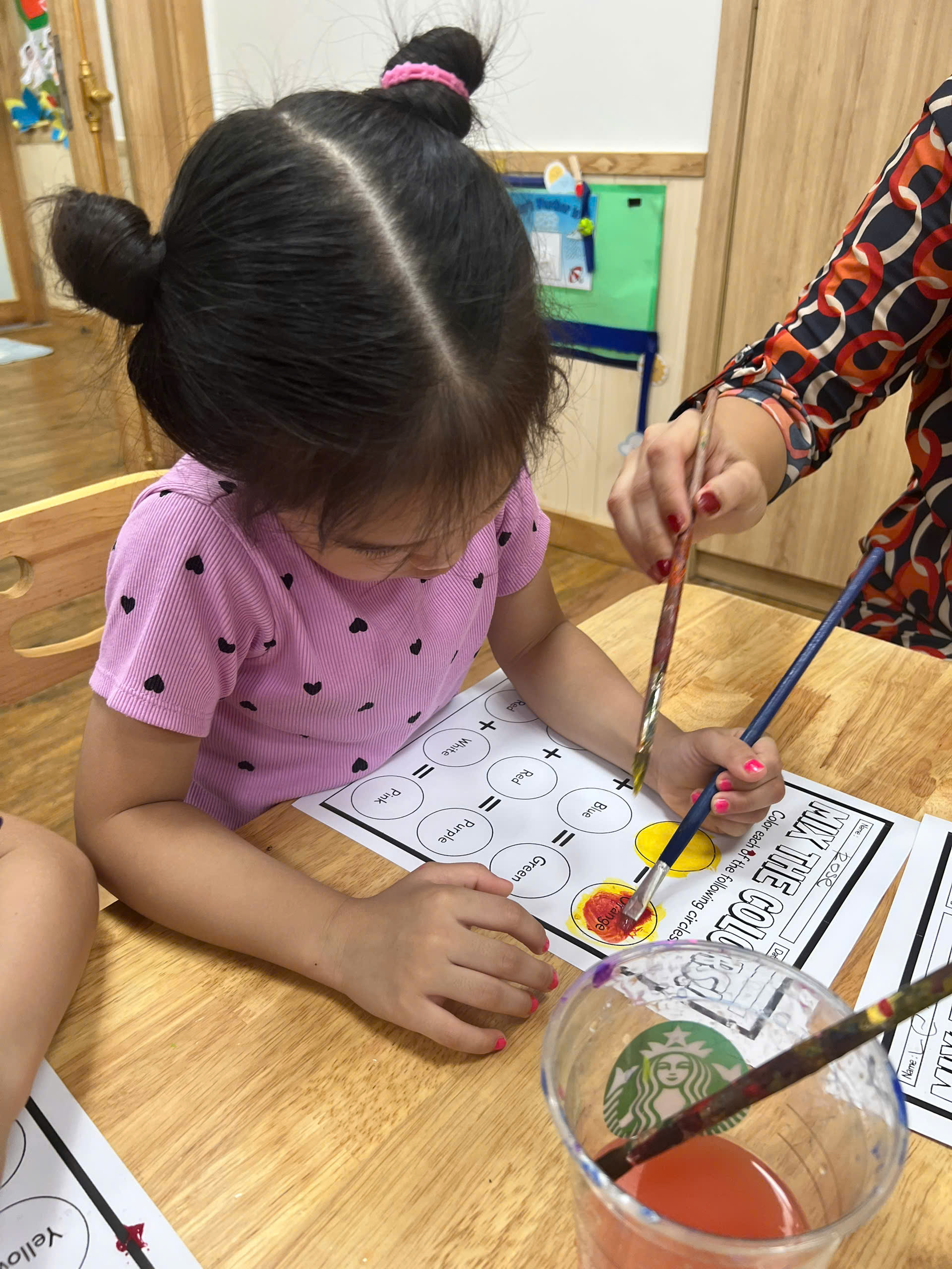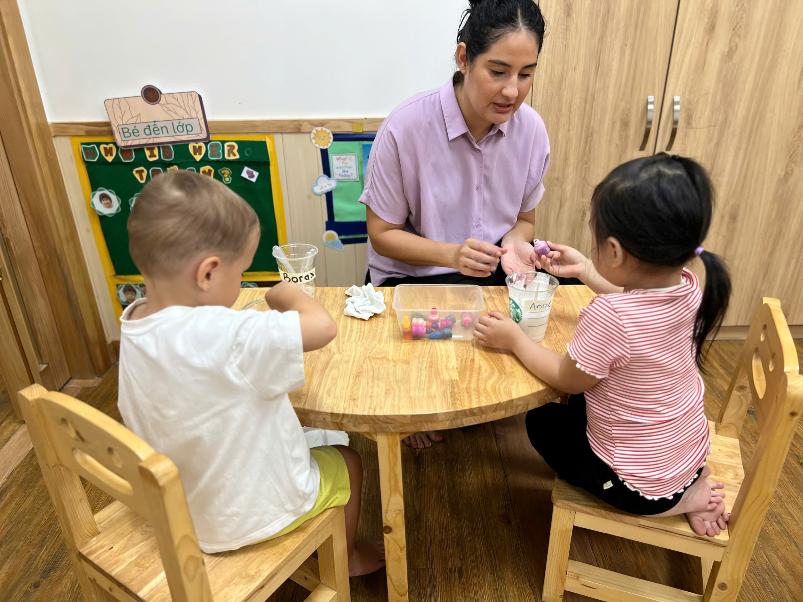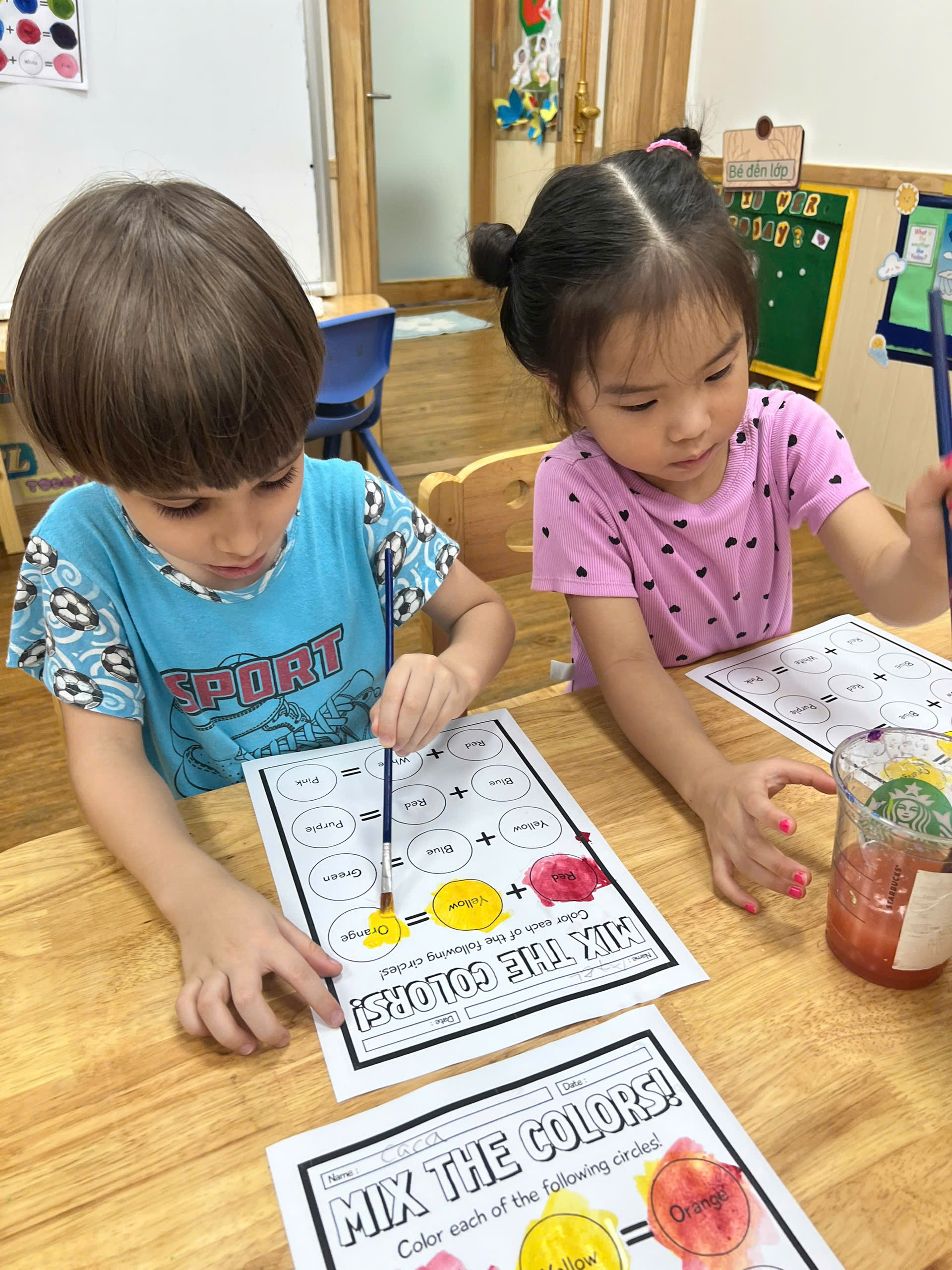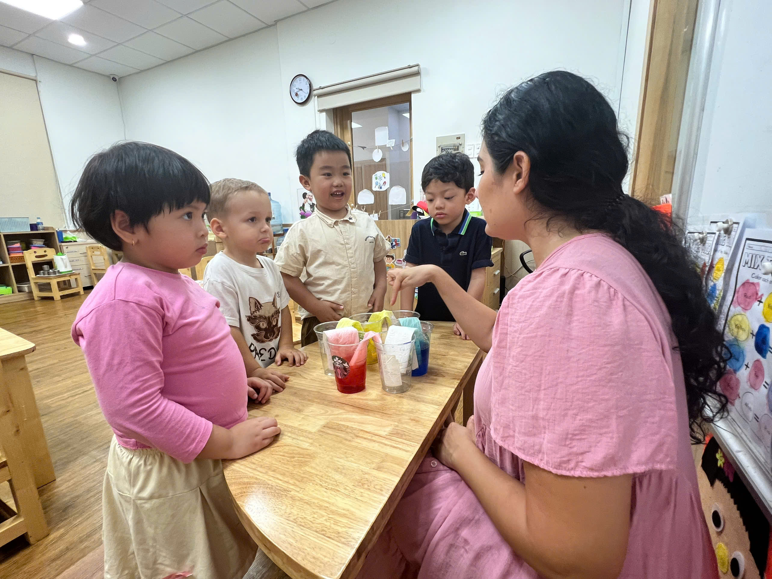 Các em đã thử thách kỹ năng dự đoán của mình bằng cách đoán xem chúng sẽ tạo ra màu mới nào khi trộn hai màu khác với nhau 🎨 Sự tò mò của các em được khơi dậy thông qua các hoạt động thực hành như Thí nghiệm Bước đi Cầu vồng, nơi các em vô cùng kinh ngạc khi chứng kiến các màu cơ bản di chuyển một cách kỳ diệu từ cốc này sang cốc khác và một màu mới xuất hiện 🌈 Các em cũng được khám phá các phản ứng hóa học và các kết cấu khác nhau bằng cách làm Slime 👨🔬 👩🔬. Để rèn luyện kỹ năng quan sát, các em đã thích thú phân loại những quả cầu lông nhiều màu sắc và ghép chúng vào đúng cốc màu. Đó là một tuần tràn ngập sự ngạc nhiên, khám phá và rất nhiều bài học đầy màu sắc và thú vị! 🥽🥼🧤🧪🌈