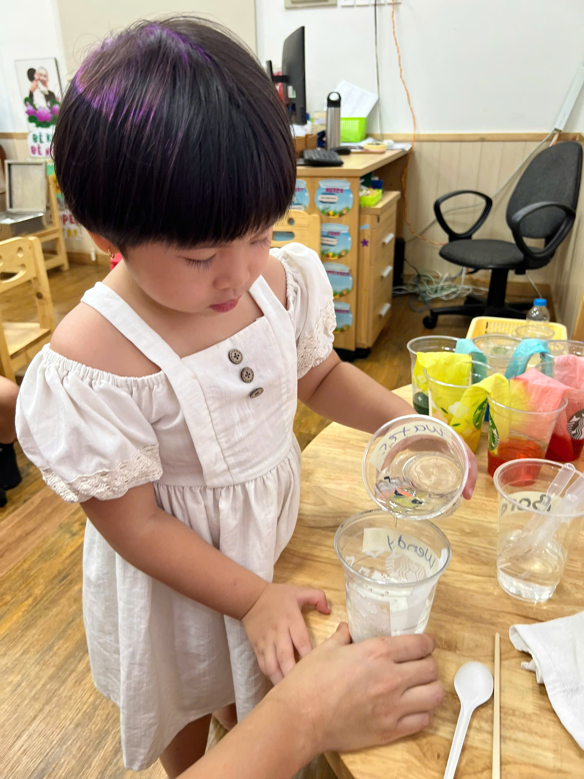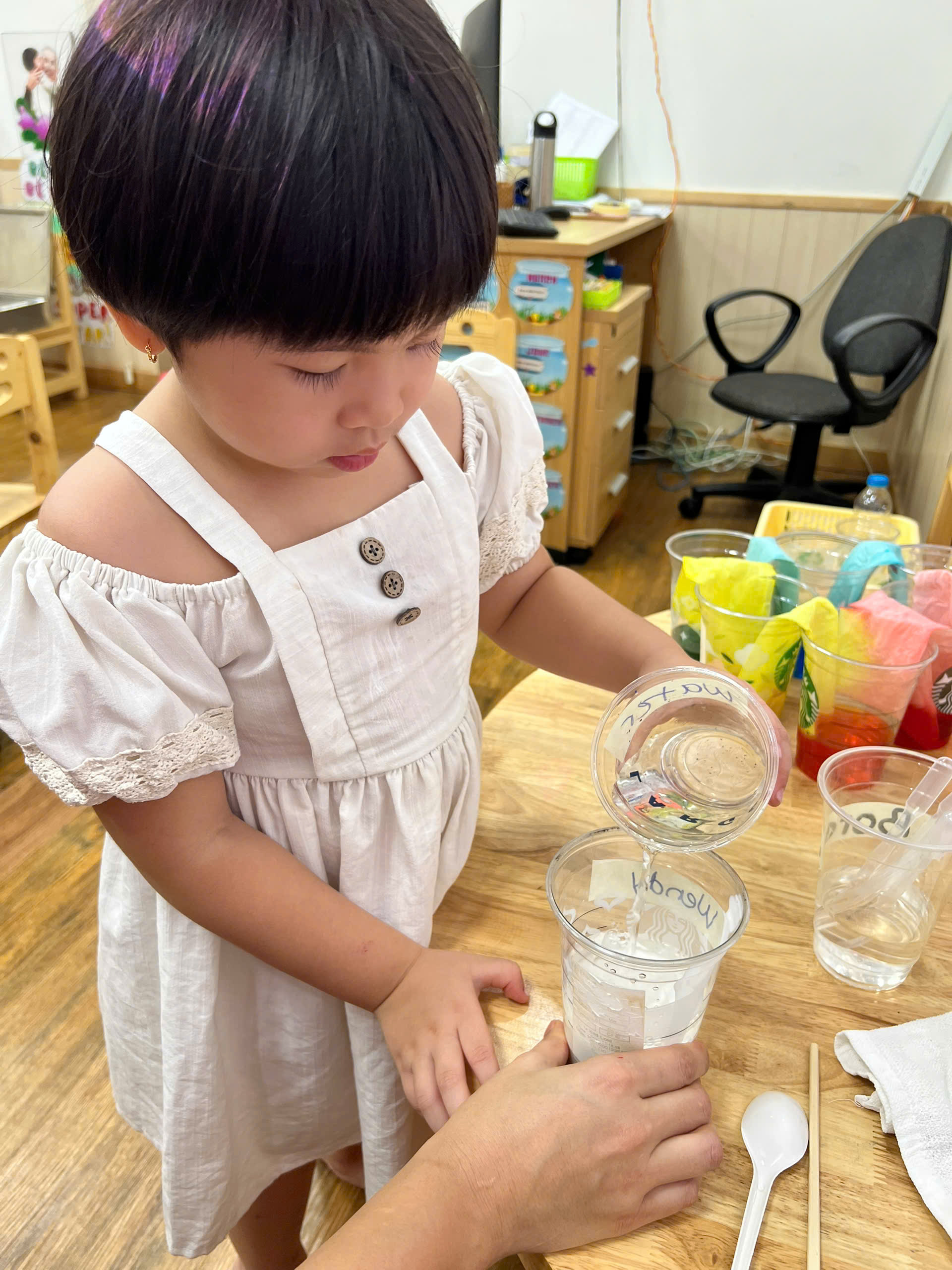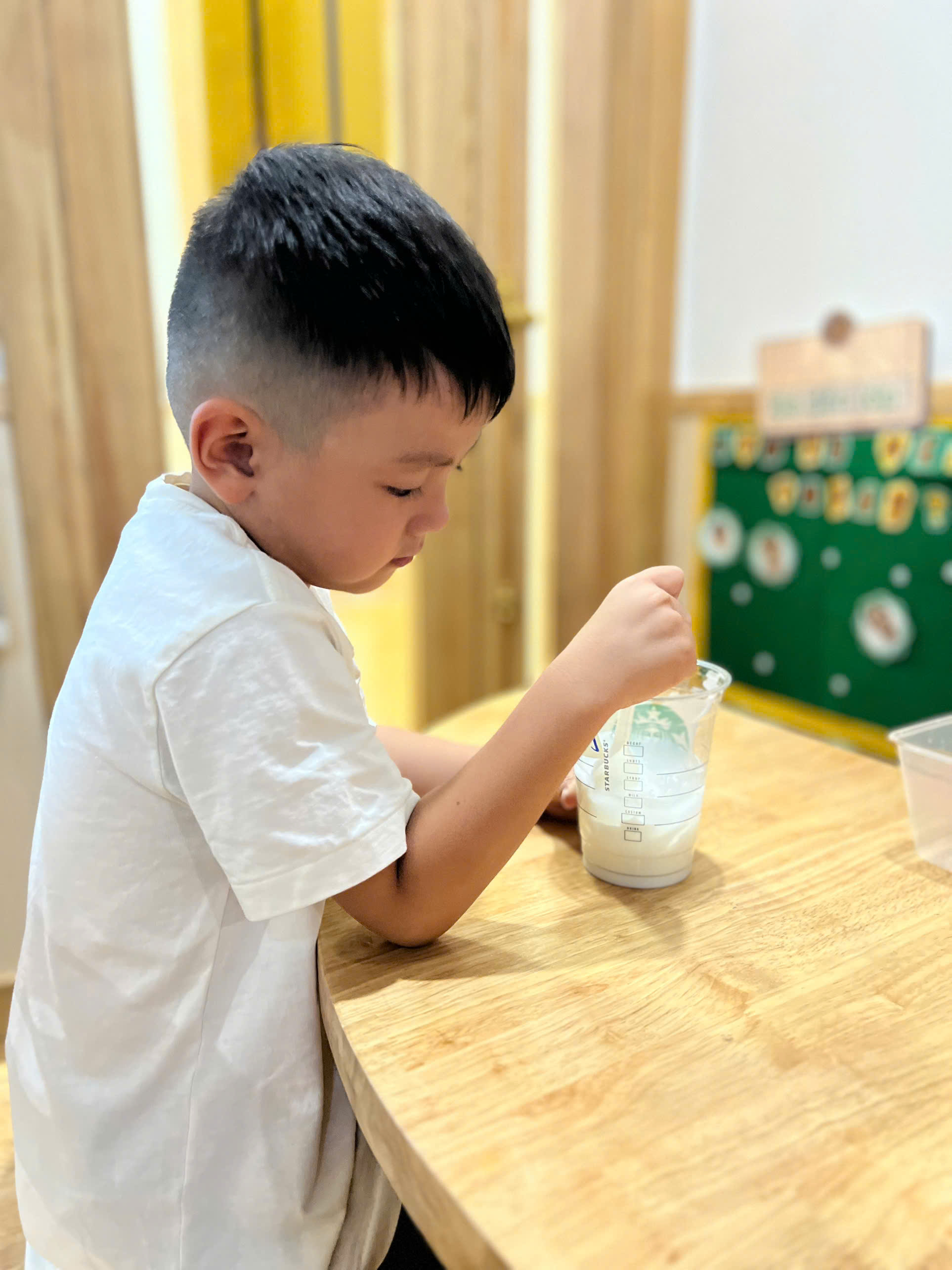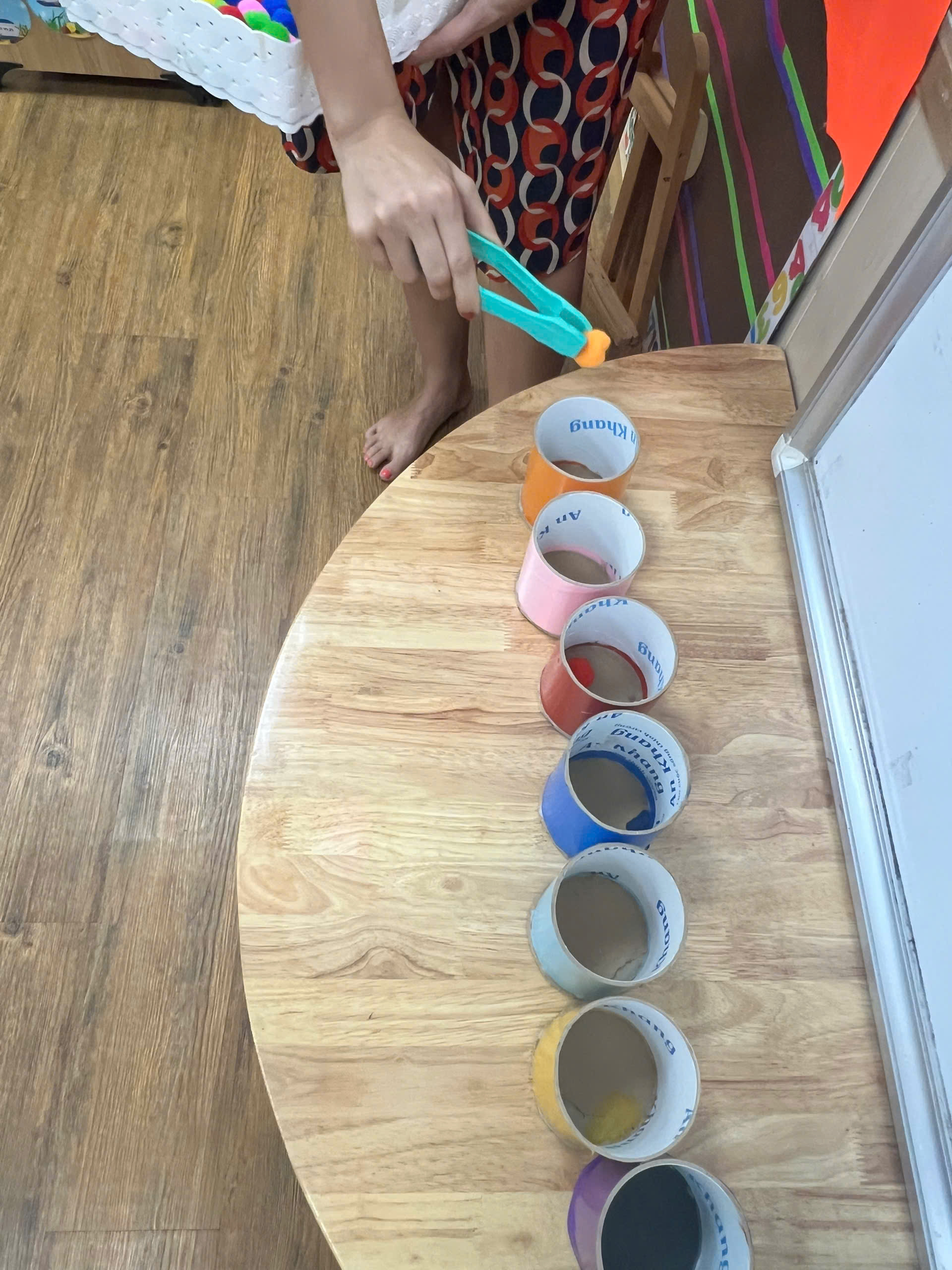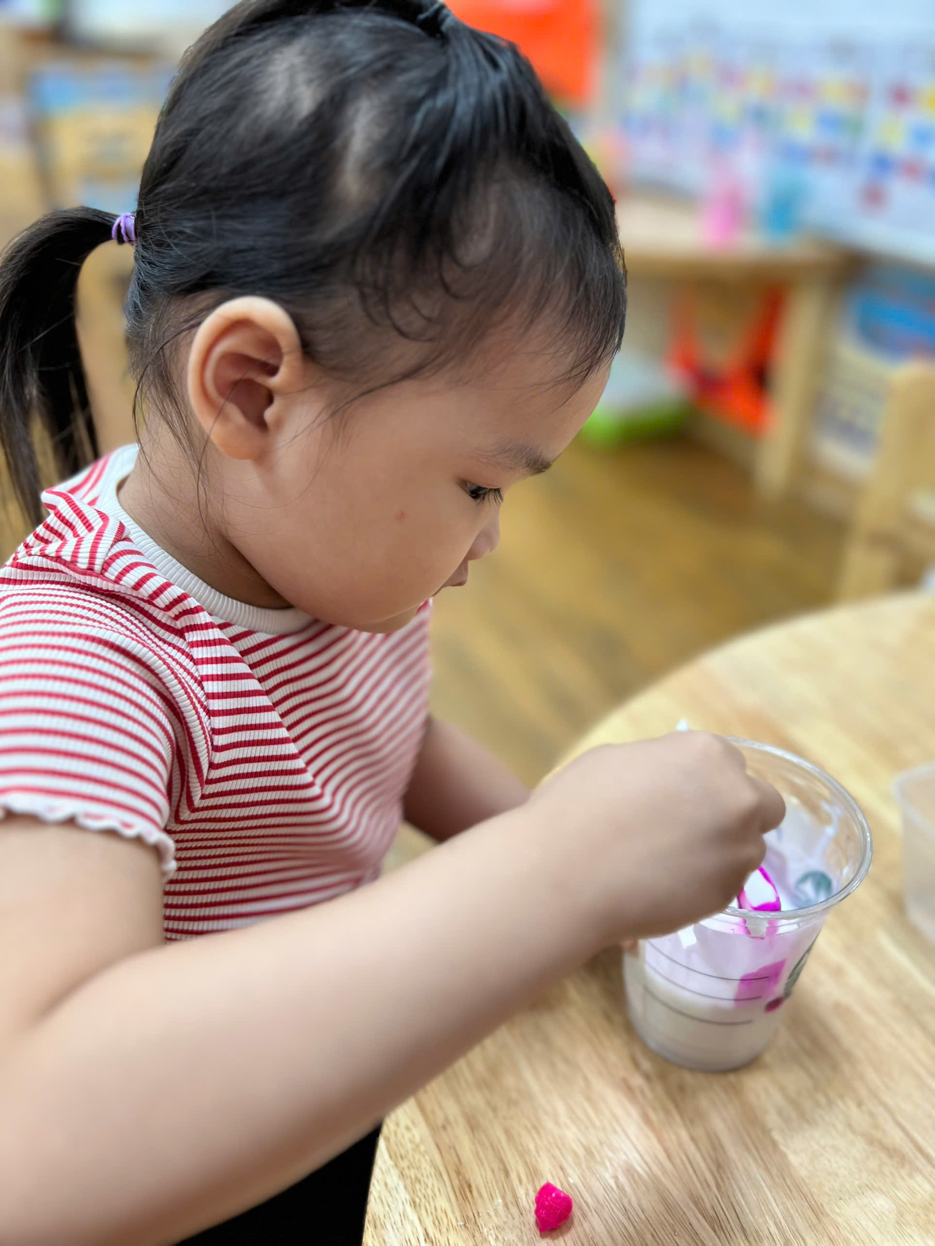 Các em đã thử thách kỹ năng dự đoán của mình bằng cách đoán xem chúng sẽ tạo ra màu mới nào khi trộn hai màu khác với nhau 🎨 Sự tò mò của các em được khơi dậy thông qua các hoạt động thực hành như Thí nghiệm Bước đi Cầu vồng, nơi các em vô cùng kinh ngạc khi chứng kiến các màu cơ bản di chuyển một cách kỳ diệu từ cốc này sang cốc khác và một màu mới xuất hiện 🌈 Các em cũng được khám phá các phản ứng hóa học và các kết cấu khác nhau bằng cách làm Slime 👨🔬 👩🔬. Để rèn luyện kỹ năng quan sát, các em đã thích thú phân loại những quả cầu lông nhiều màu sắc và ghép chúng vào đúng cốc màu. Đó là một tuần tràn ngập sự ngạc nhiên, khám phá và rất nhiều bài học đầy màu sắc và thú vị! 🥽🥼🧤🧪🌈