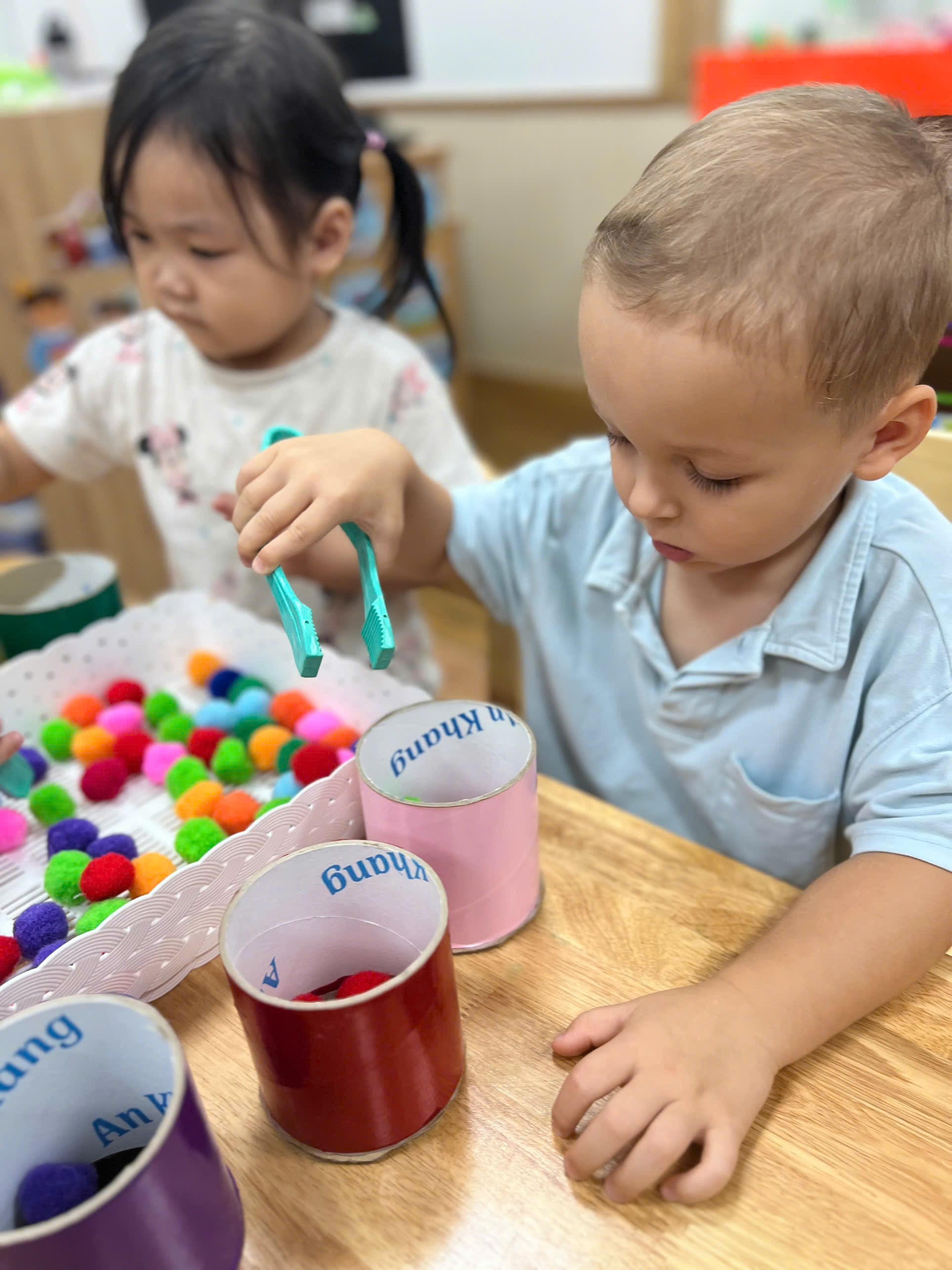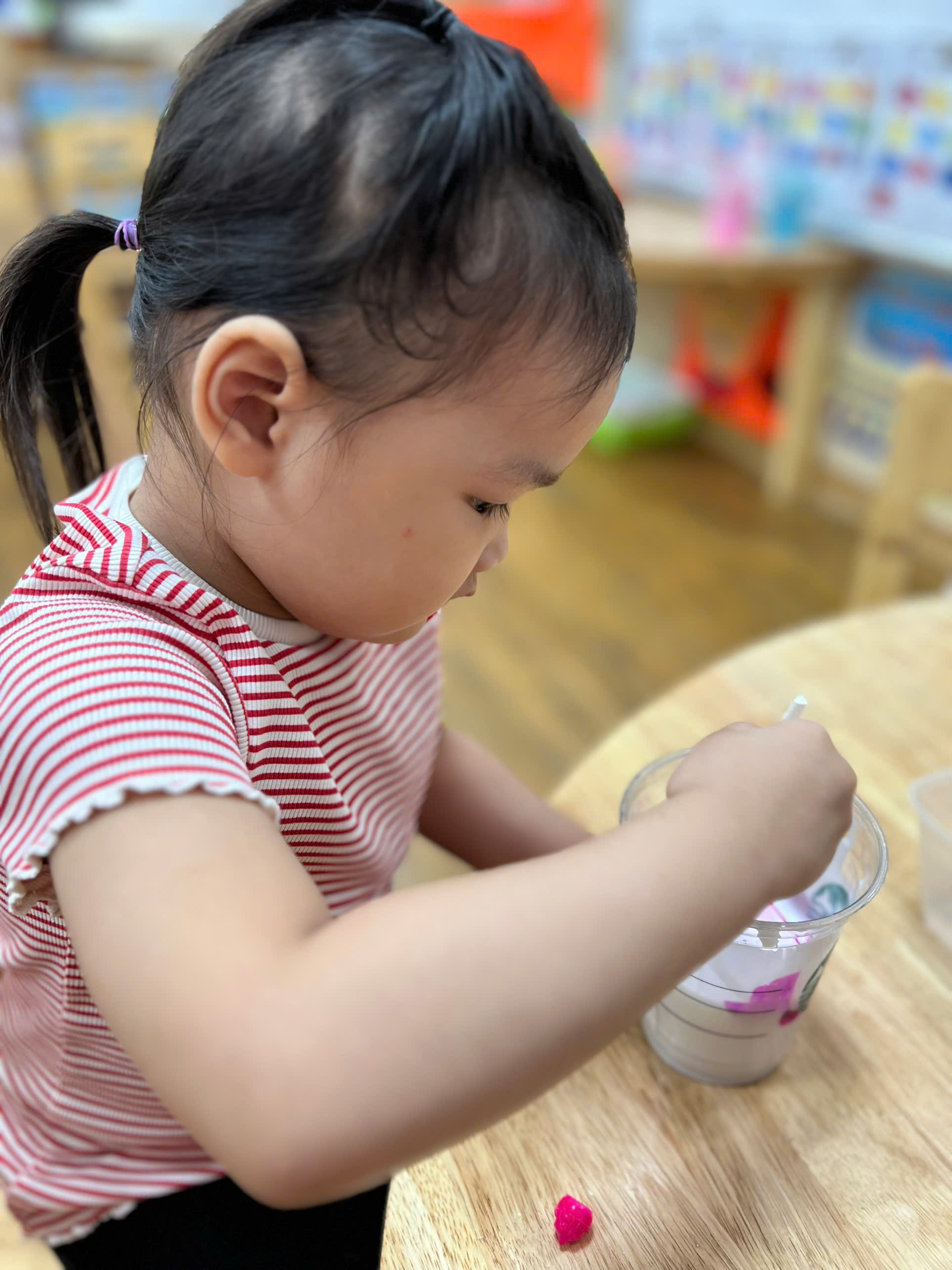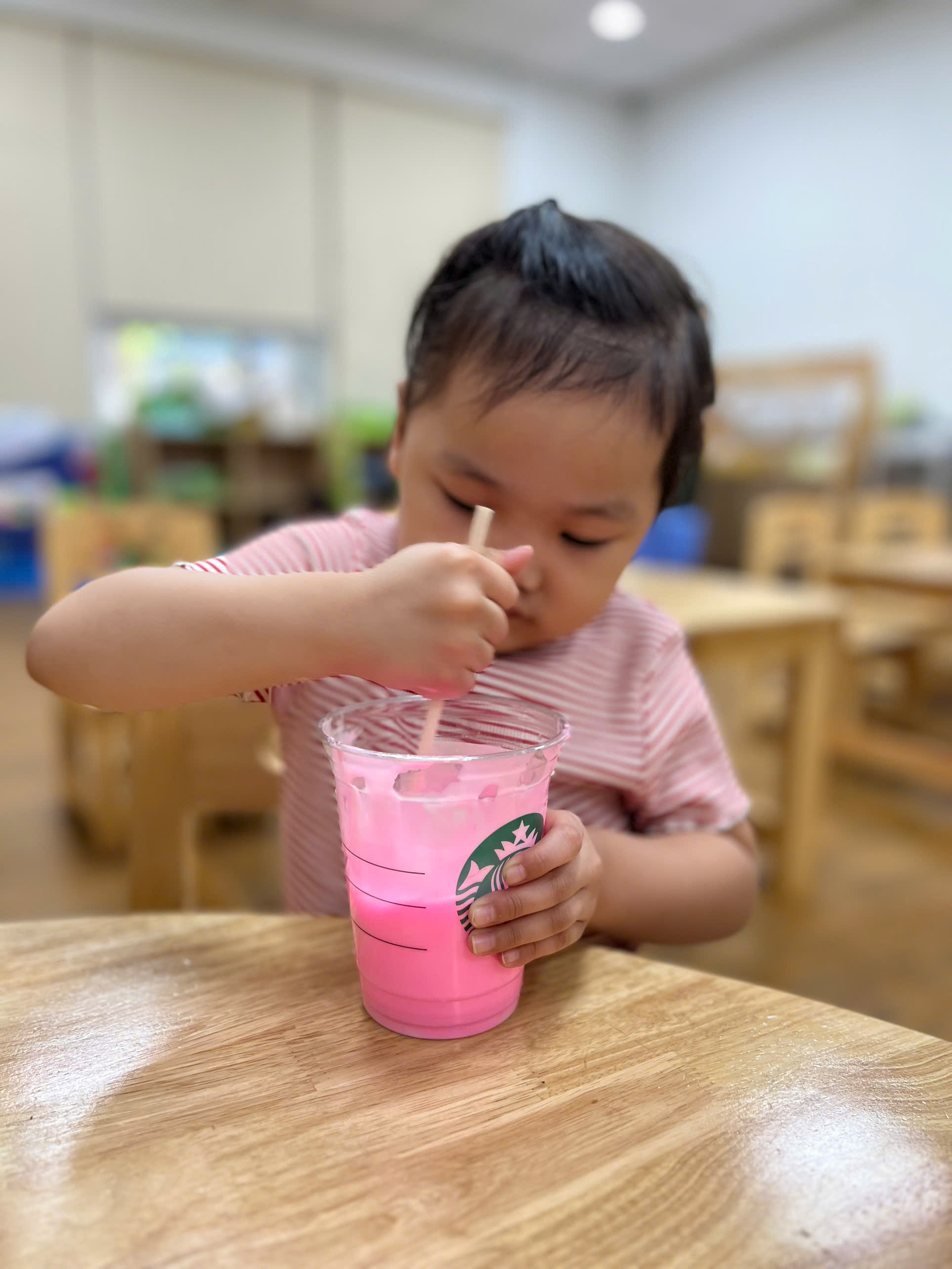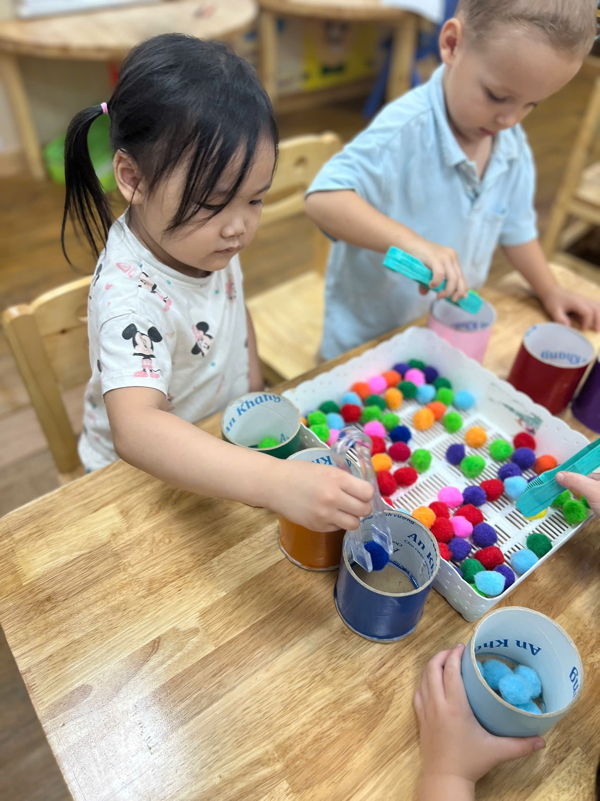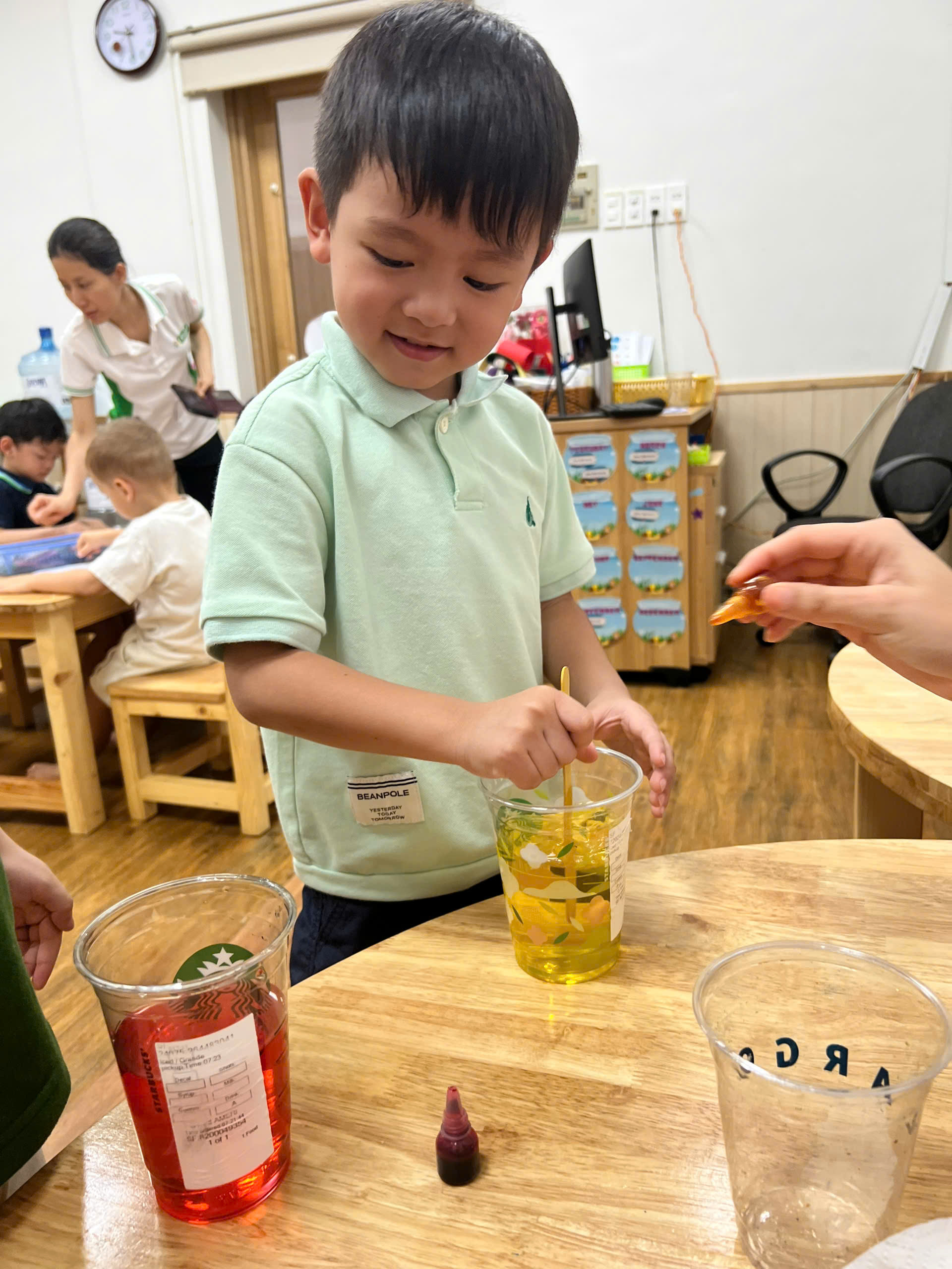Các em đã thử thách kỹ năng dự đoán của mình bằng cách đoán xem chúng sẽ tạo ra màu mới nào khi trộn hai màu khác với nhau 🎨 Sự tò mò của các em được khơi dậy thông qua các hoạt động thực hành như Thí nghiệm Bước đi Cầu vồng, nơi các em vô cùng kinh ngạc khi chứng kiến các màu cơ bản di chuyển một cách kỳ diệu từ cốc này sang cốc khác và một màu mới xuất hiện 🌈 Các em cũng được khám phá các phản ứng hóa học và các kết cấu khác nhau bằng cách làm Slime 👨🔬 👩🔬. Để rèn luyện kỹ năng quan sát, các em đã thích thú phân loại những quả cầu lông nhiều màu sắc và ghép chúng vào đúng cốc màu. Đó là một tuần tràn ngập sự ngạc nhiên, khám phá và rất nhiều bài học đầy màu sắc và thú vị! 🥽🥼🧤🧪🌈