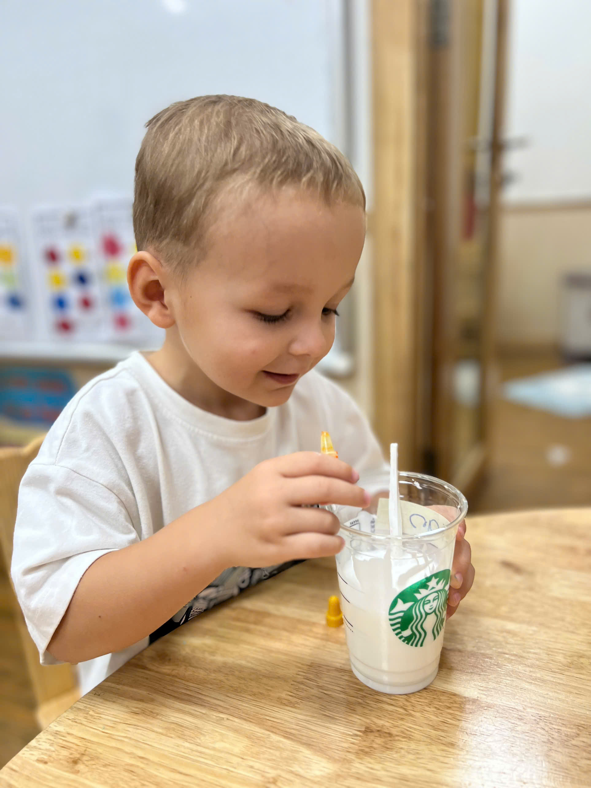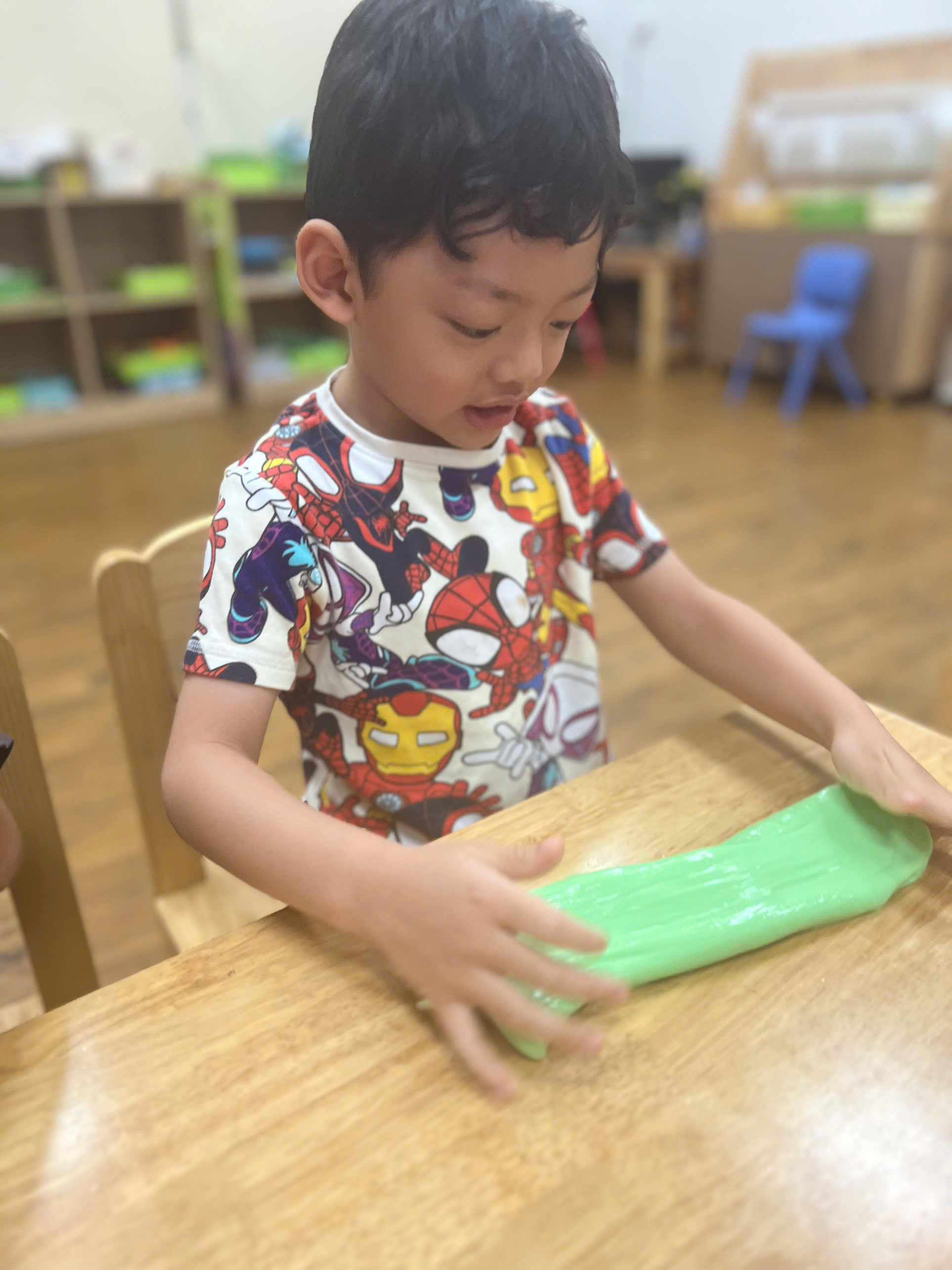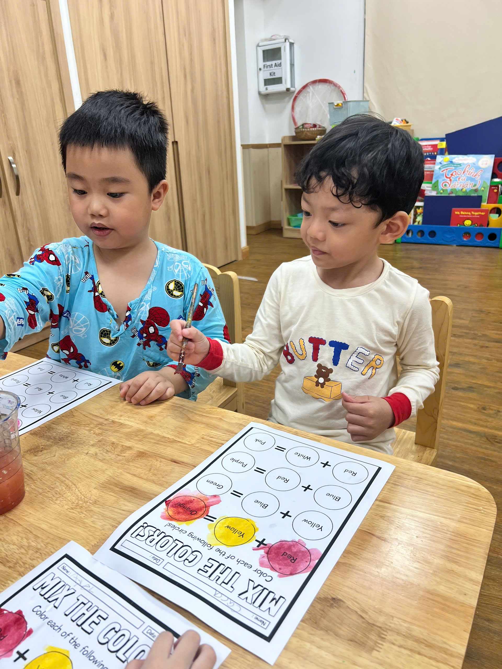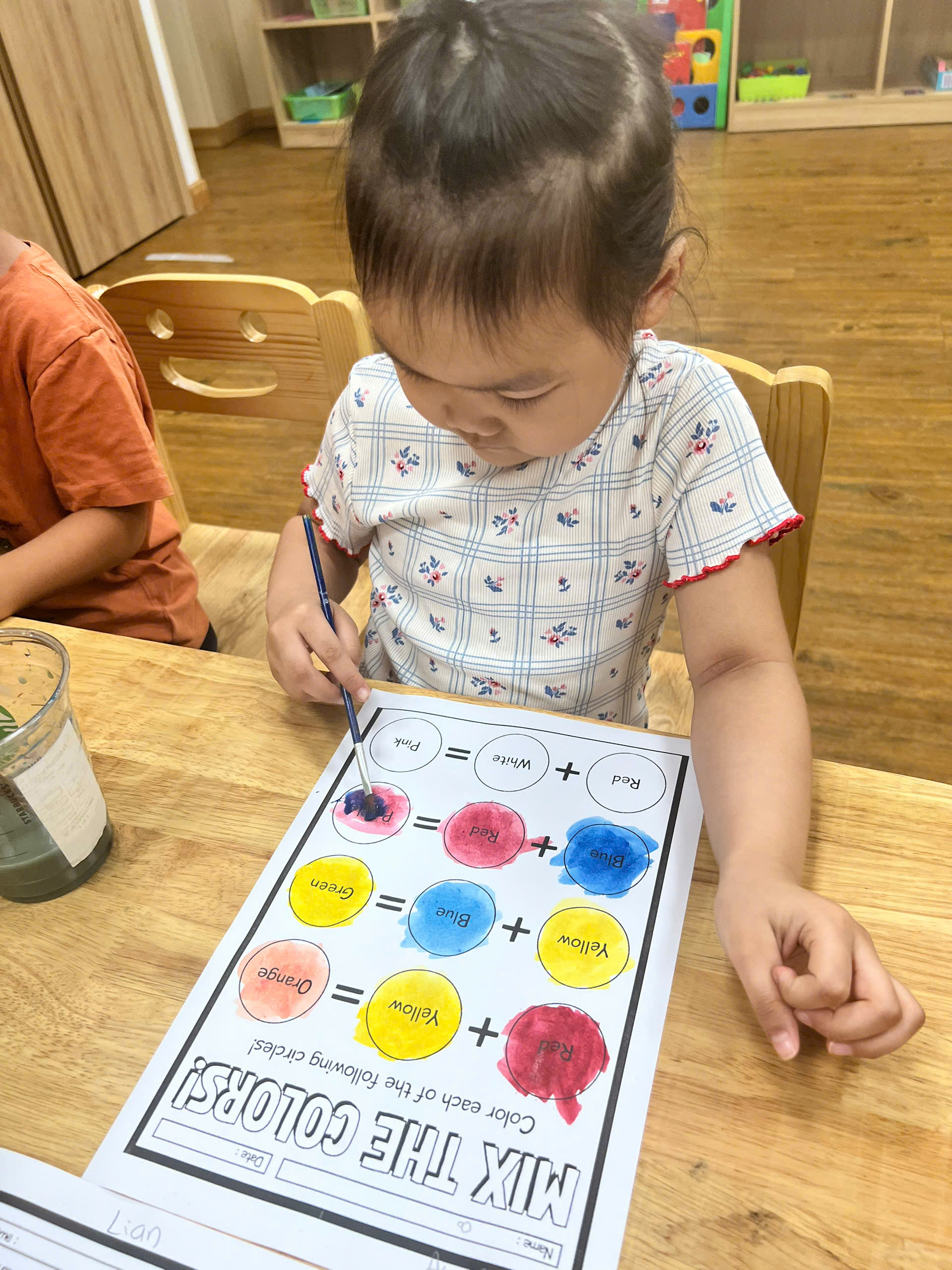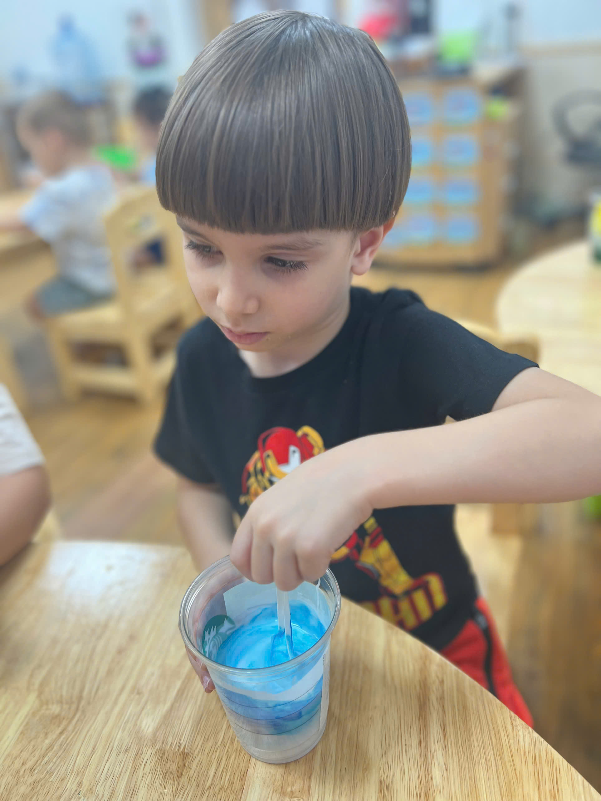 Các em đã thử thách kỹ năng dự đoán của mình bằng cách đoán xem chúng sẽ tạo ra màu mới nào khi trộn hai màu khác với nhau 🎨 Sự tò mò của các em được khơi dậy thông qua các hoạt động thực hành như Thí nghiệm Bước đi Cầu vồng, nơi các em vô cùng kinh ngạc khi chứng kiến các màu cơ bản di chuyển một cách kỳ diệu từ cốc này sang cốc khác và một màu mới xuất hiện 🌈 Các em cũng được khám phá các phản ứng hóa học và các kết cấu khác nhau bằng cách làm Slime 👨🔬 👩🔬. Để rèn luyện kỹ năng quan sát, các em đã thích thú phân loại những quả cầu lông nhiều màu sắc và ghép chúng vào đúng cốc màu. Đó là một tuần tràn ngập sự ngạc nhiên, khám phá và rất nhiều bài học đầy màu sắc và thú vị! 🥽🥼🧤🧪🌈