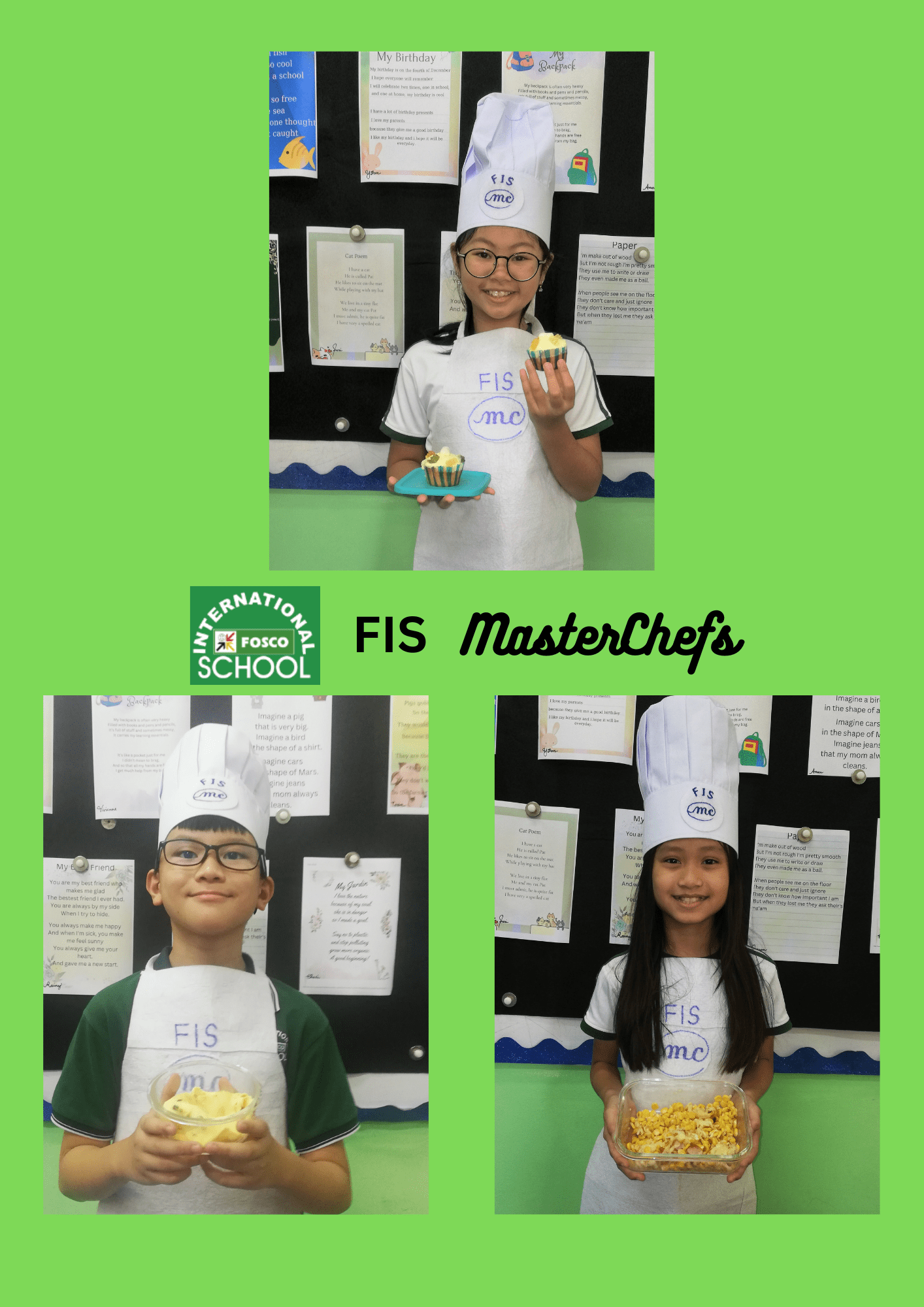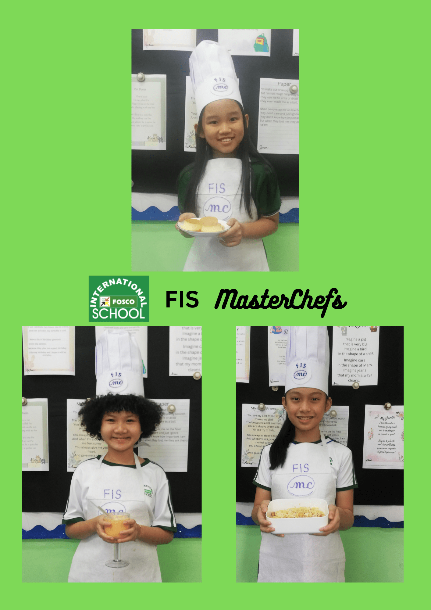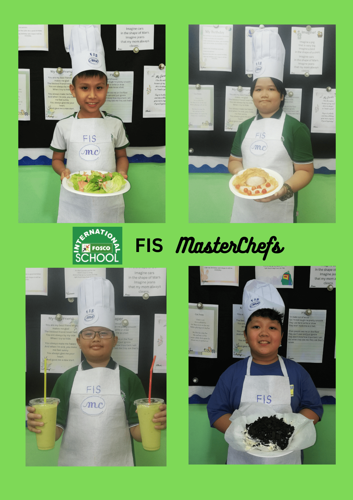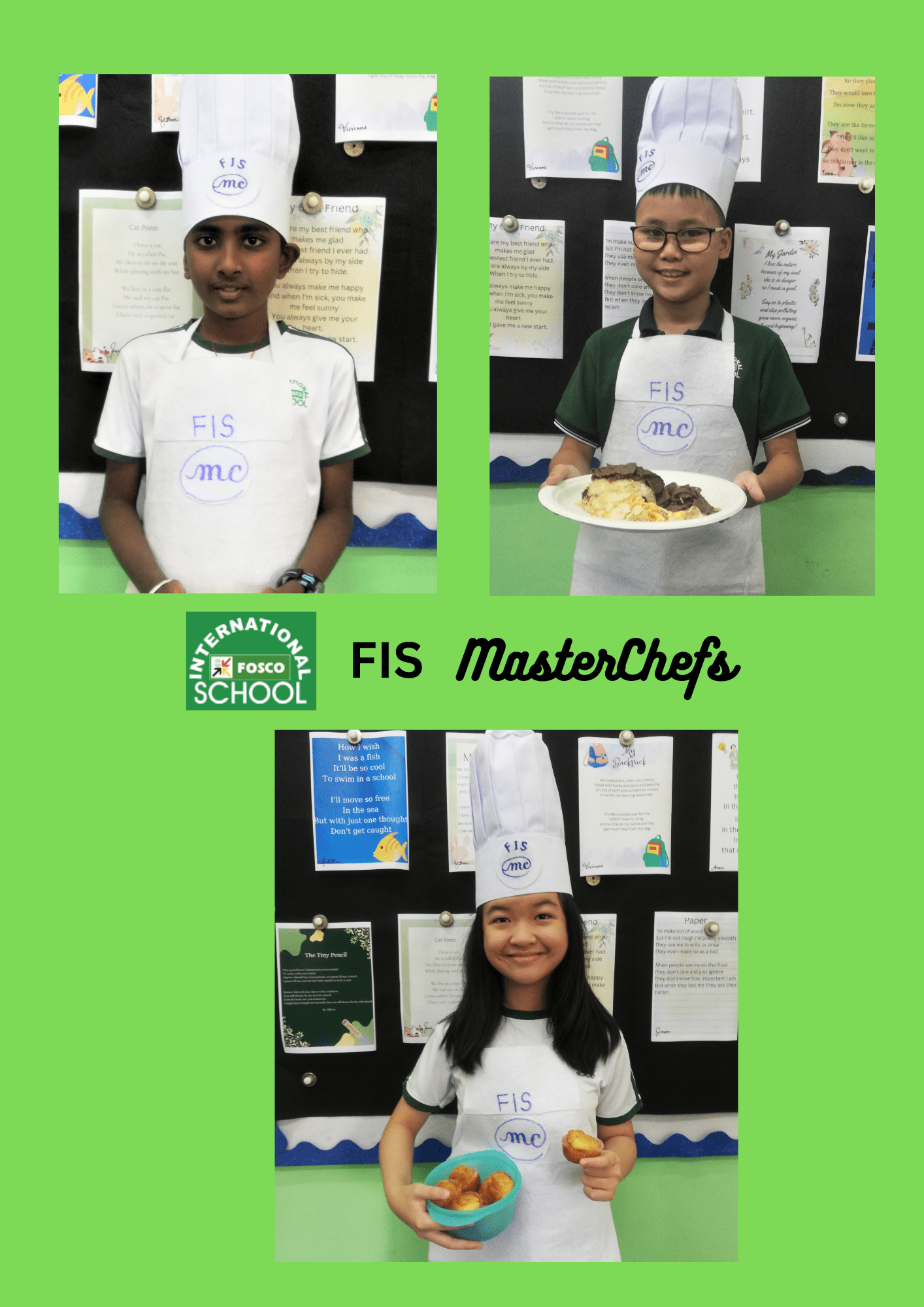 Cuộc thi Đầu Bếp FIS 2023 (FIS MasterChef) là một thành công lớn. Đây là một hoạt động thường niên nơi mà các em học sinh có thể vận dụng trí tưởng tượng, kiến thức đã học và các kết quả học tập tích hợp từ các môn học như Tin học, Tiếng anh, Khoa học, Toán học và Xã hội học. Mục tiêu là để các em làm quen với các nhóm thực phẩm, học cách sơ chế và nấu ăn những món đơn giản, sáng tạo, thể hiện nghệ thuật bày trí món ăn, vận dụng các khái niệm trong kinh tế gia đình, tự chủ (với sự giám sát của người lớn khi cần thiết), tập trung vào chi tiết, học từ mới, học cách chỉnh sửa video, thiết kế poster, giải thích, thuyết trình nội dung với khán giả.