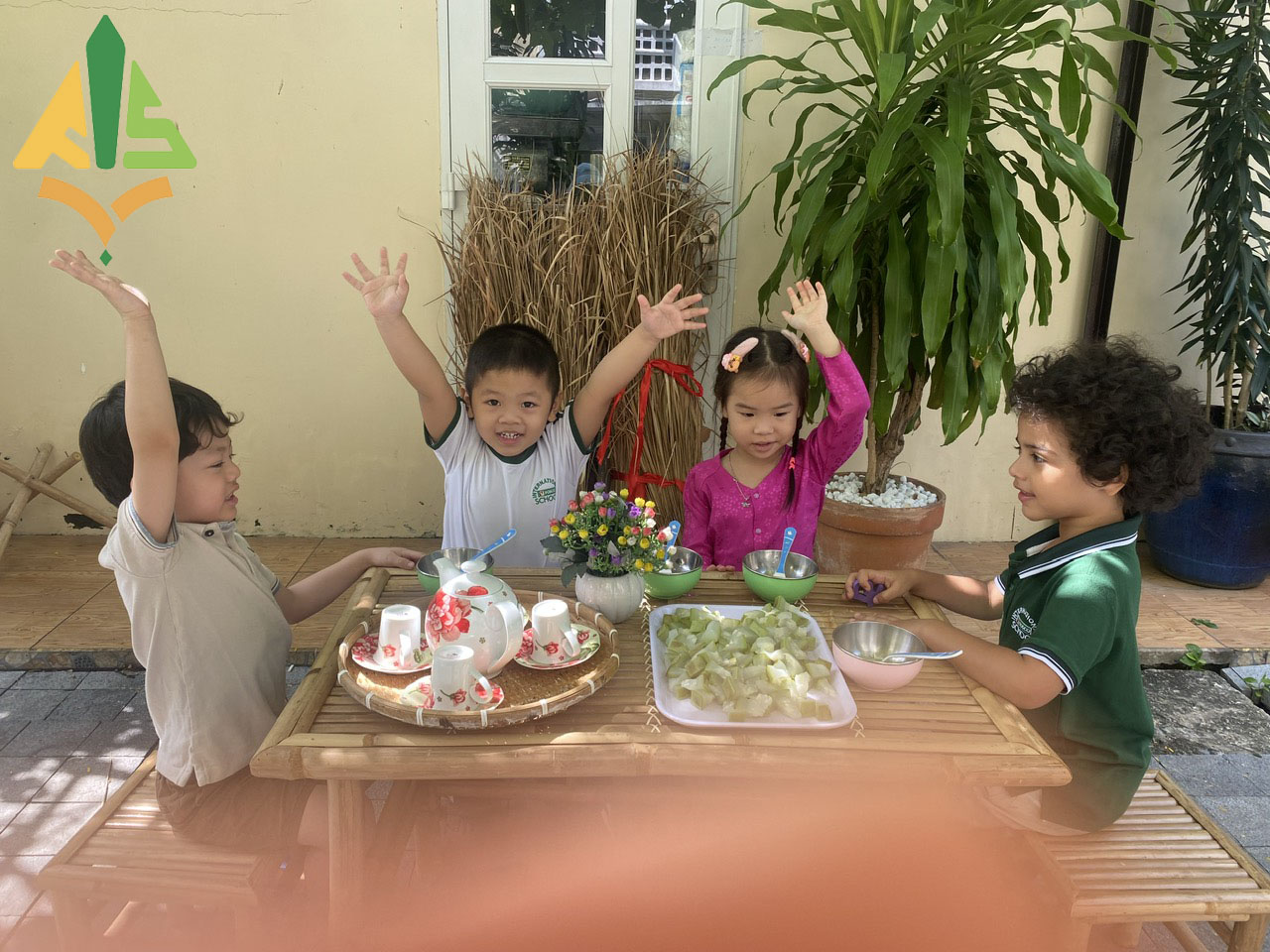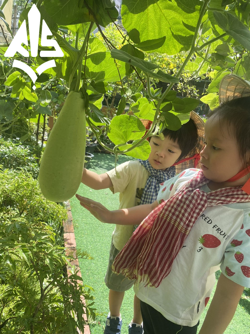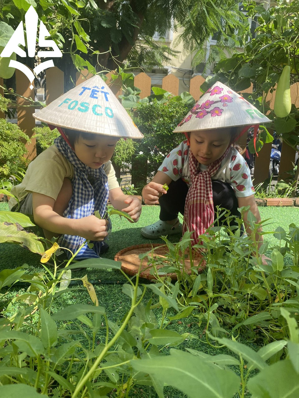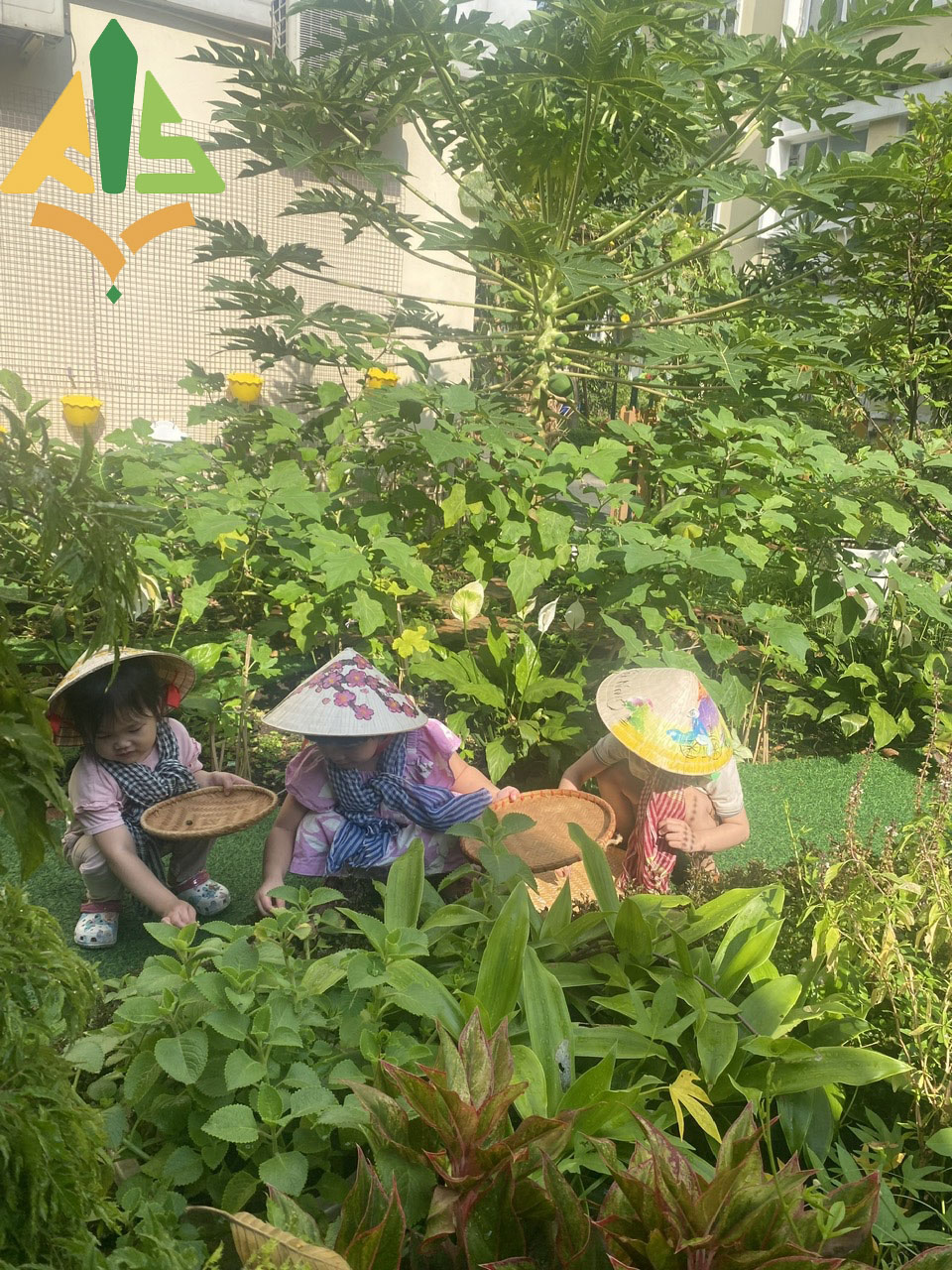 Dưới ánh nắng ấm áp, những em bé lớp Chồi làm vườn nhỏ bé của chúng tôi đang làm việc chăm chỉ, trông vô cùng đáng yêu trong chiếc mũ và khăn quàng nhỏ xíu của mình. Với đôi tay cẩn thận và đôi mắt sáng, các em háo hức hái những loại cây trồng mà chúng tôi đã cùng nhau nuôi dưỡng, kinh ngạc trước từng loại rau tươi và lá xanh. Thật là vui khi thấy các em kết nối với thiên nhiên, học được phép màu của việc tự trồng thực phẩm—mỗi lần thu hoạch một ít!