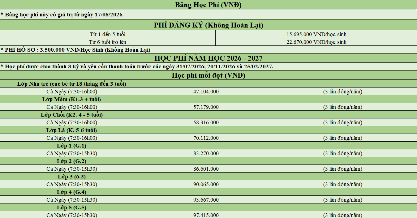 HỌC PHÍ ĐƠN NGỮ TRƯỜNG QUỐC TẾ FOSCO NĂM 2026 – 2027