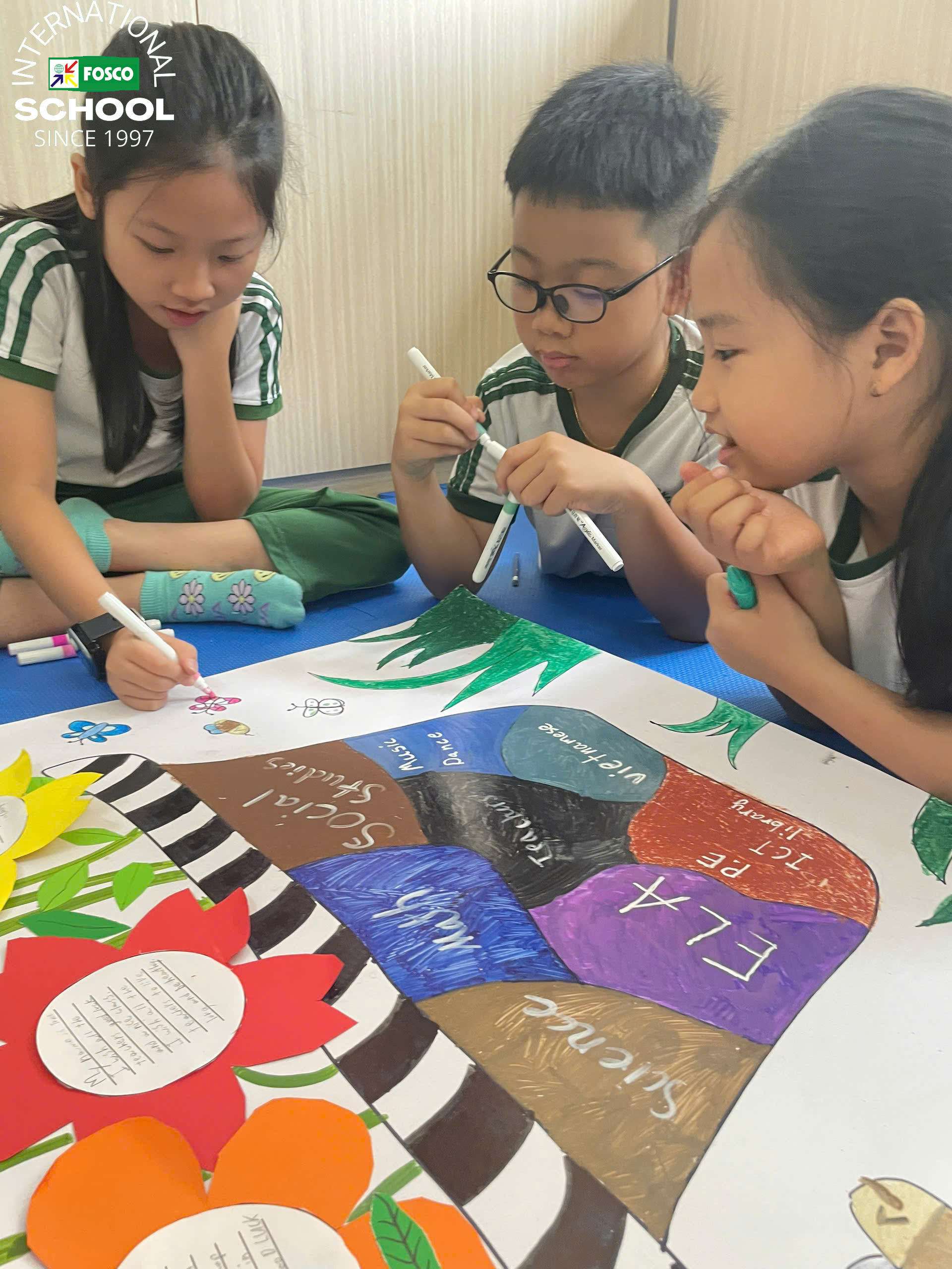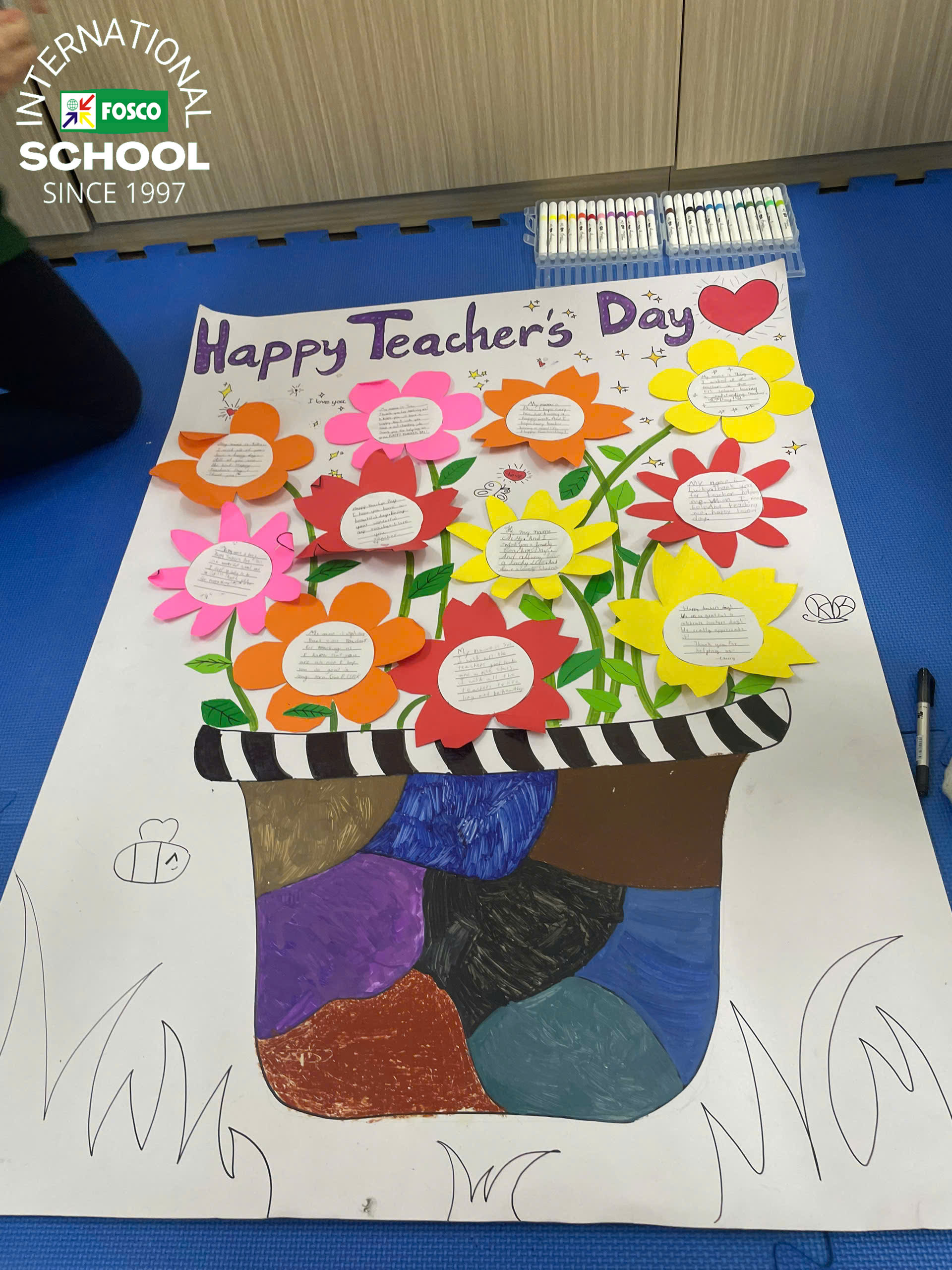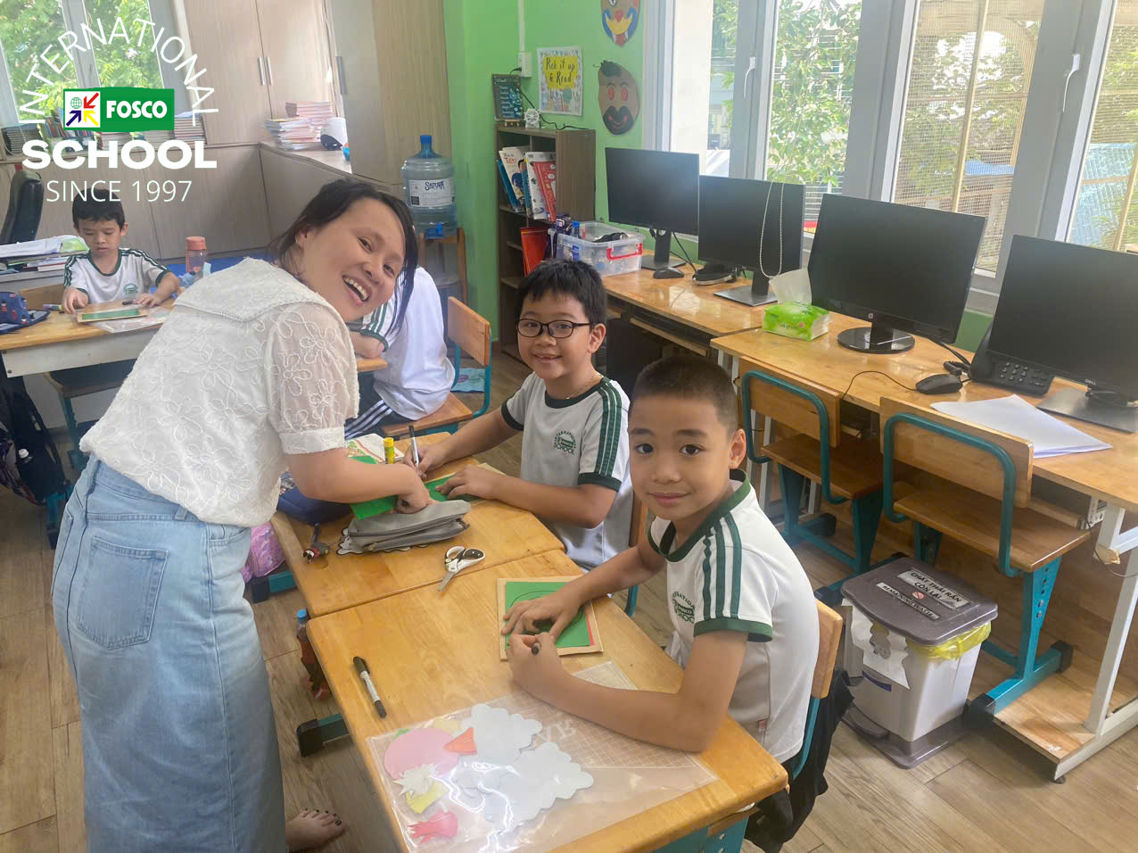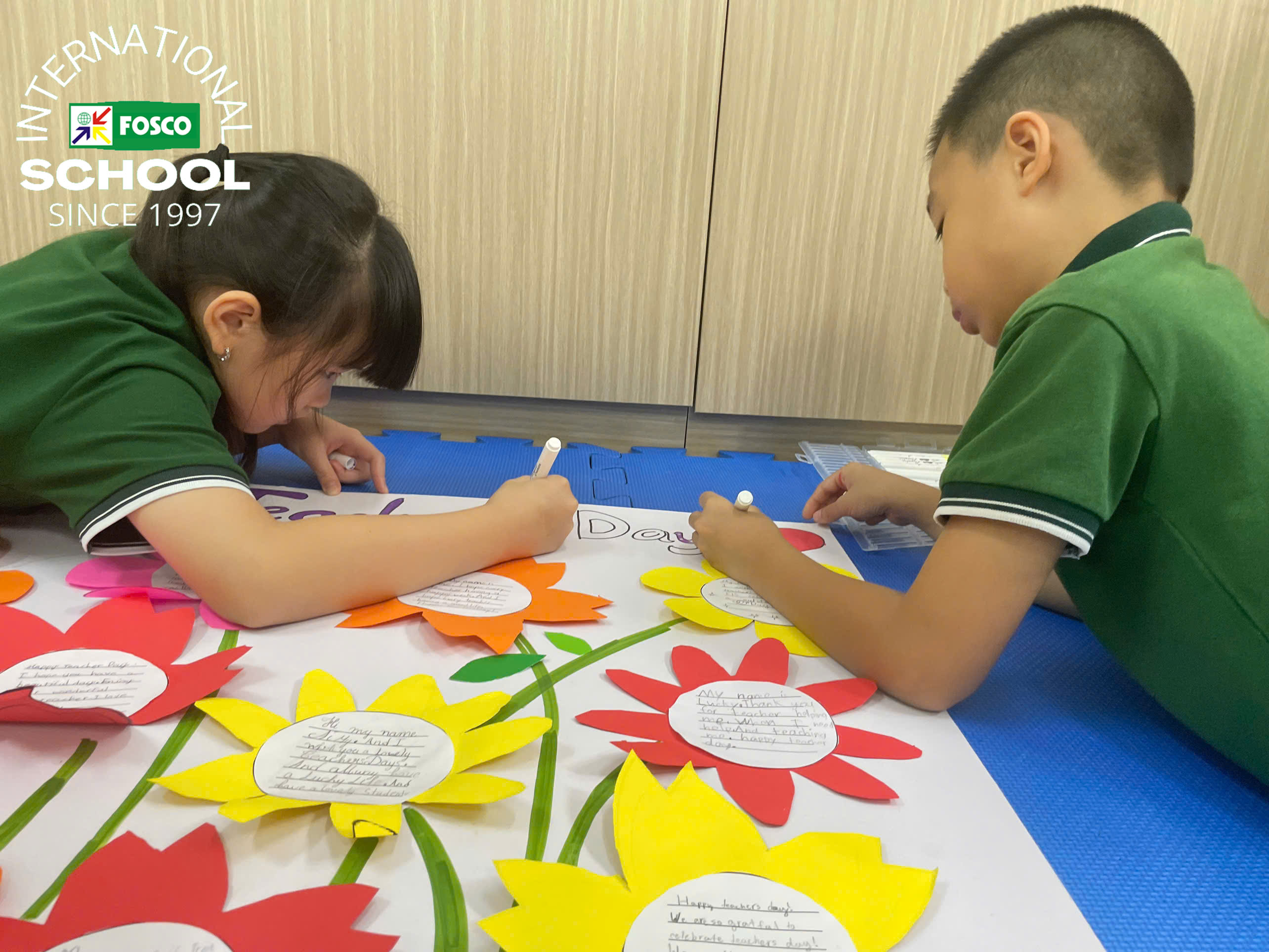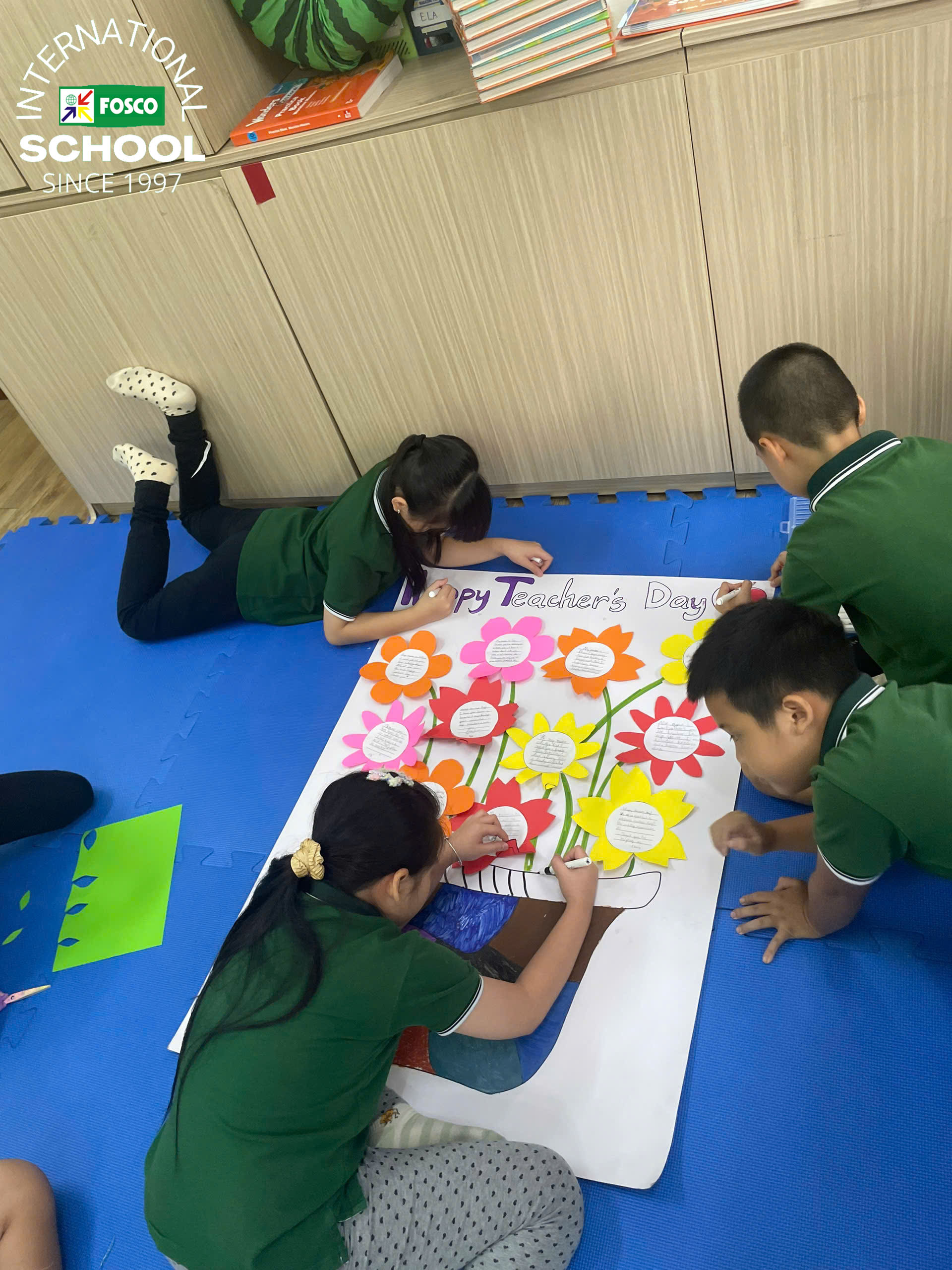Nhân dịp chuẩn bị chào mừng Ngày Nhà giáo, các em lớp 3 đã khám phá ra nhiều cách khác nhau để bày tỏ lòng biết ơn đối với quý thầy cô kính yêu của mình. Lớp chúng tôi rất thích làm đồ thủ công với cô Vi; cùng nhau làm báo tường tri ân cho thầy cô với những bông hoa to là một cách tuyệt vời để các em biến lòng tri ân của mình thành hành động.