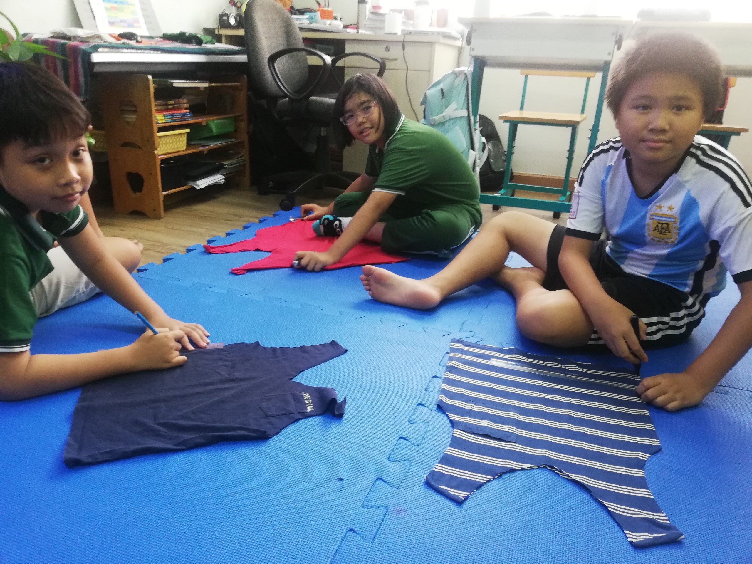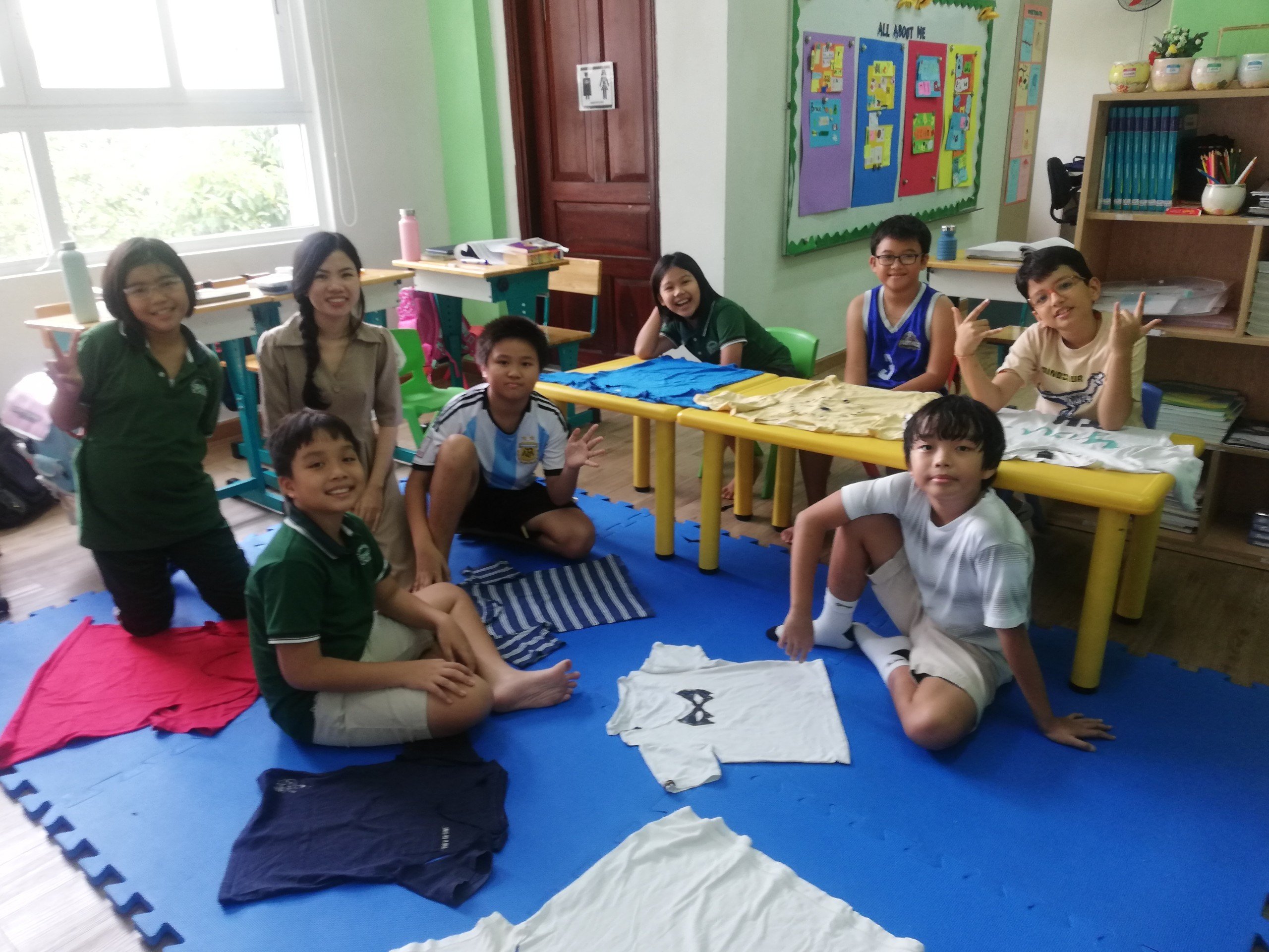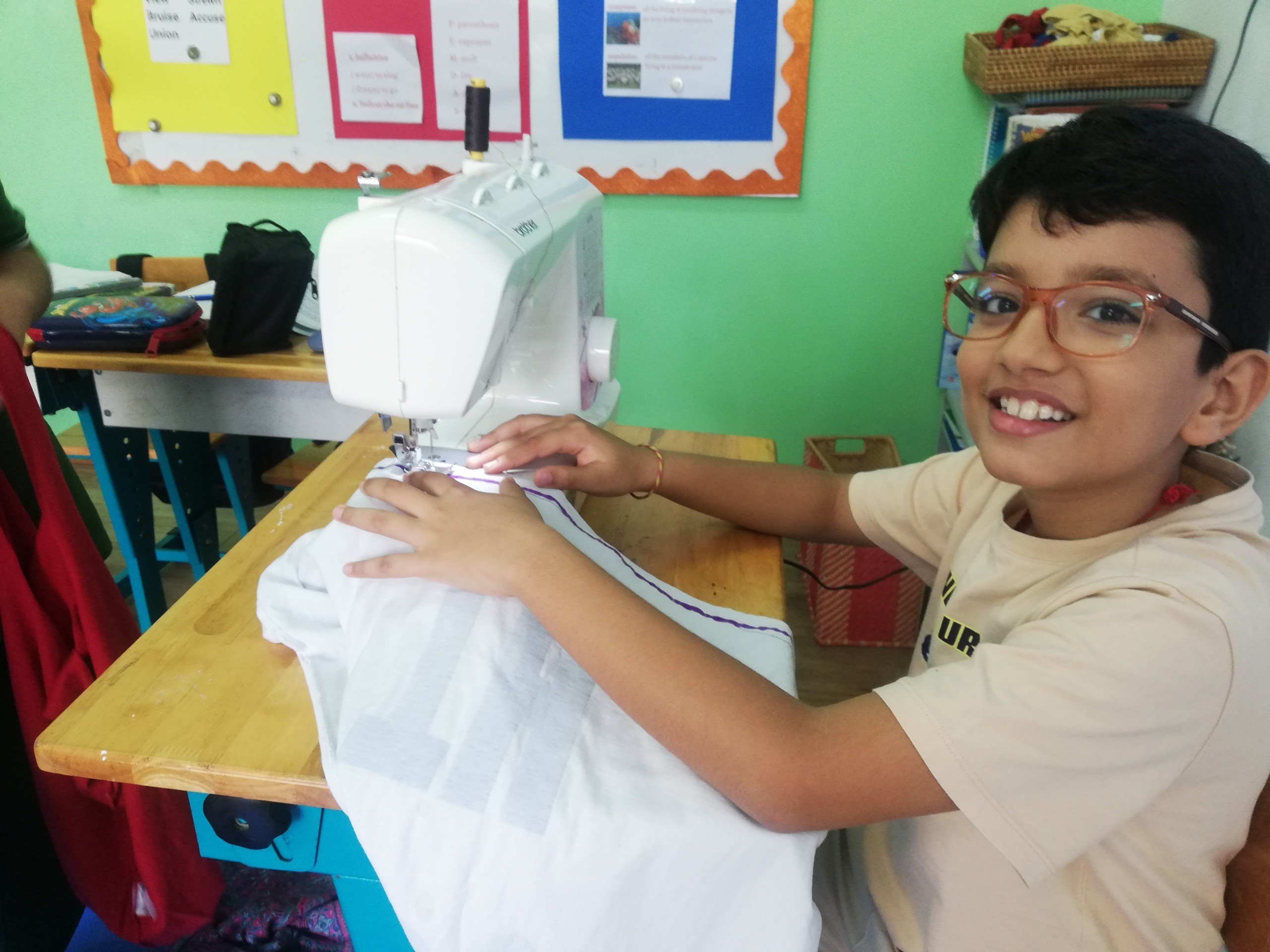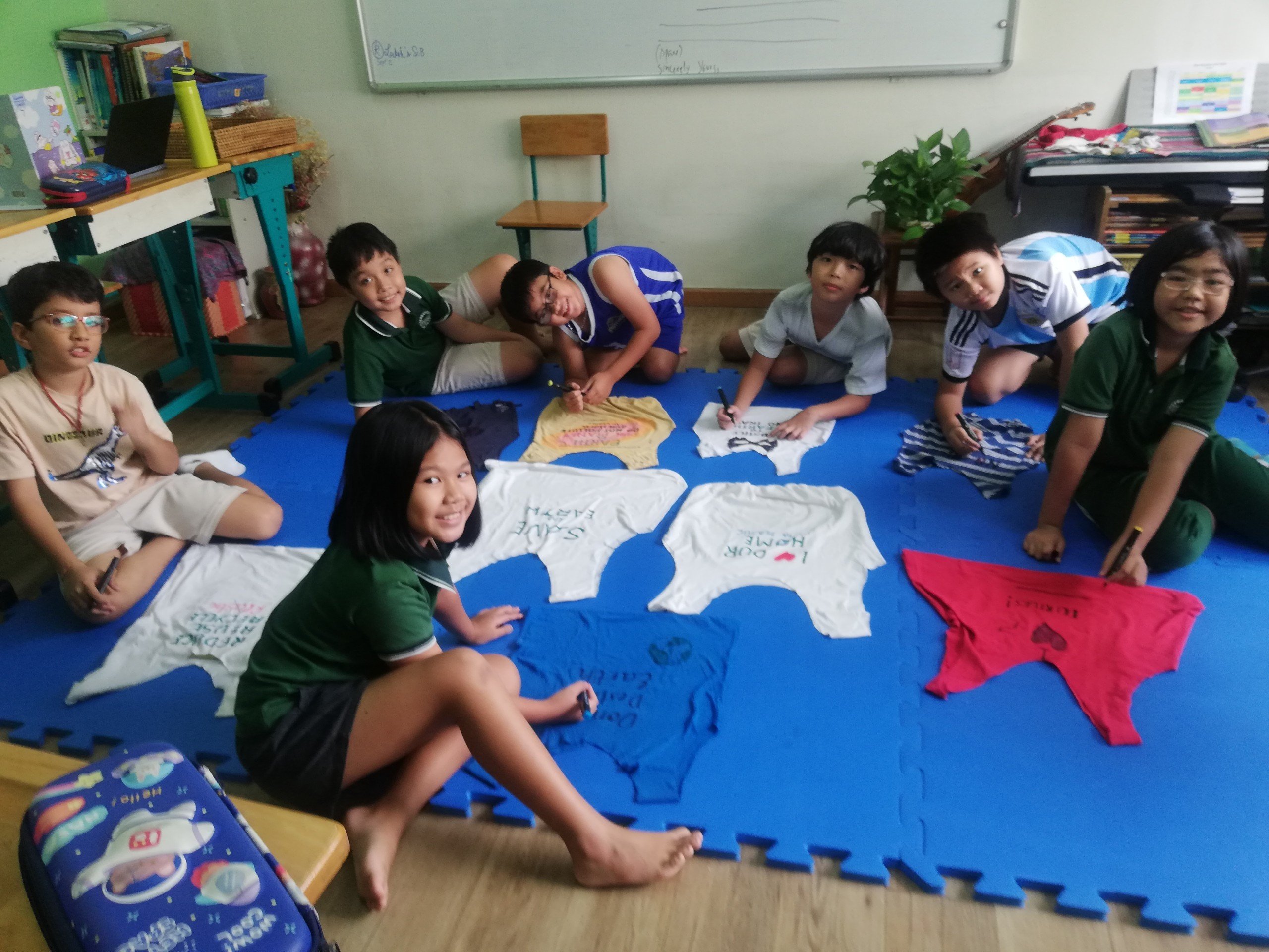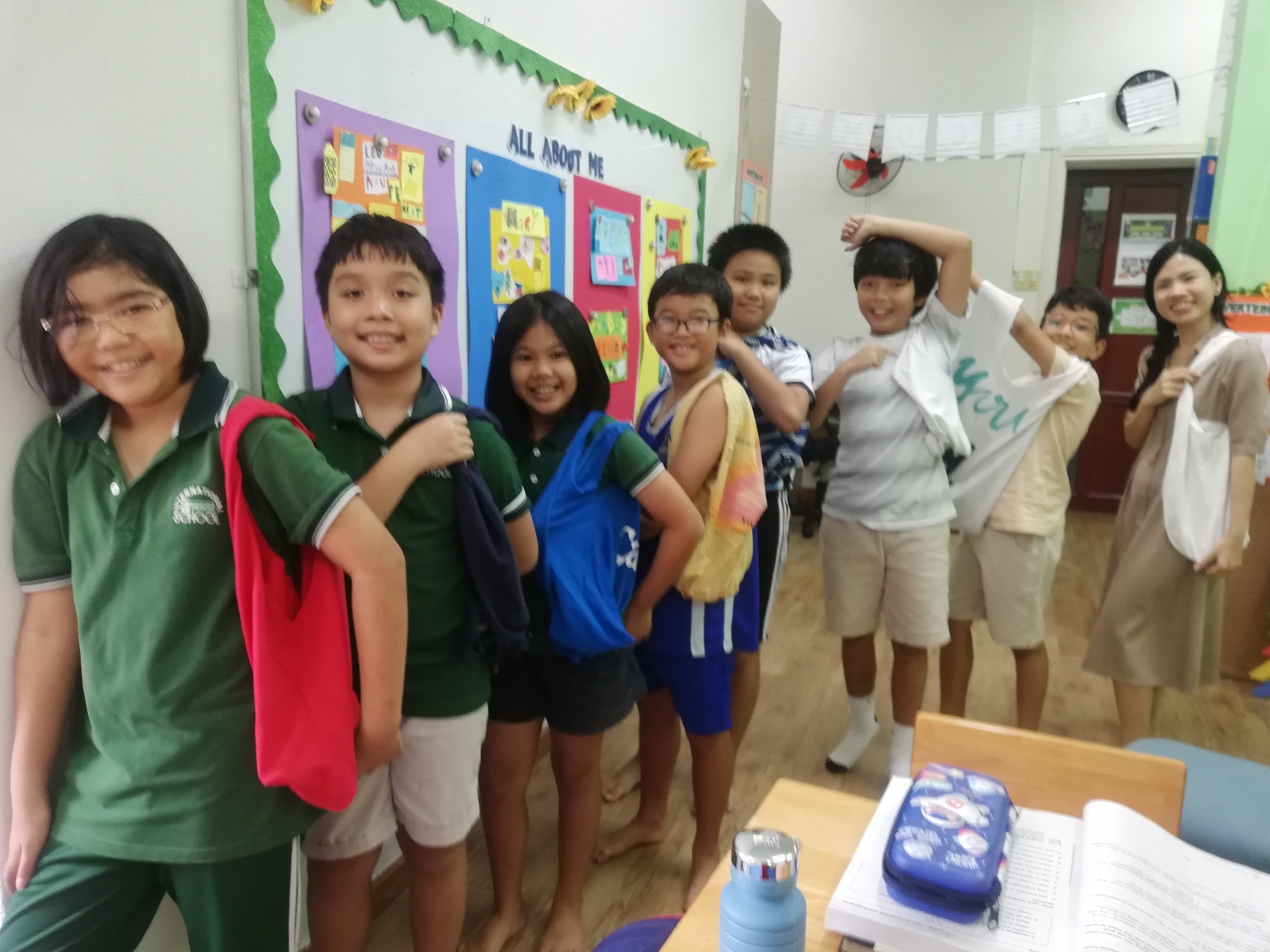 Trong môn Khoa học, Học sinh Lớp 5 đang tìm hiểu về việc con người tác động và thay đổi hệ sinh thái như thế nào. Chúng tôi nhận ra rằng nhiều hoạt động của con người đã và đang gây hại cho môi trường rất nhiều như sử dụng quá nhiều nhựa. Ví dụ, một món đồ nhỏ mua ở cửa hàng tiện lợi, và chúng được đựng trong túi nhựa. Mọi người cũng nên có trách nhiệm sử dụng những chiếc túi có thể tái sử dụng như những chiếc túi tote/ túi vải mà các em đã làm trong lớp để có thể bảo vệ môi trường khỏi những tác động của việc sử dụng quá nhiều đồ nhựa. Các em học sinh lớp 5 làm túi tote bằng cách tái chế áo phông cũ. Các em muốn gửi thông điệp tới mọi người rằng có thể sử dụng túi tote cá nhân, tái sử dụng khi đến các cửa hàng tiện lợi. Học sinh cũng viết thư cho người quản lý các cửa hàng tiện lợi không nên phát ra quá nhiều đồ nhựa. Giáo dục lại người dân về việc không sử dụng nhựa hoặc sử dụng túi tote có thể tái sử dụng thì sẽ giúp ích rất nhiều trong việc bảo vệ môi trường của chúng ta. Đó là một dự án thú vị, hấp dẫn mà các em học sinh rất đam mê. Học sinh đã học cách may vá bằng máy khâu. Những chiếc túi tote khác được làm theo phong cách không đường may bằng cách buộc tua rua ở phía dưới.