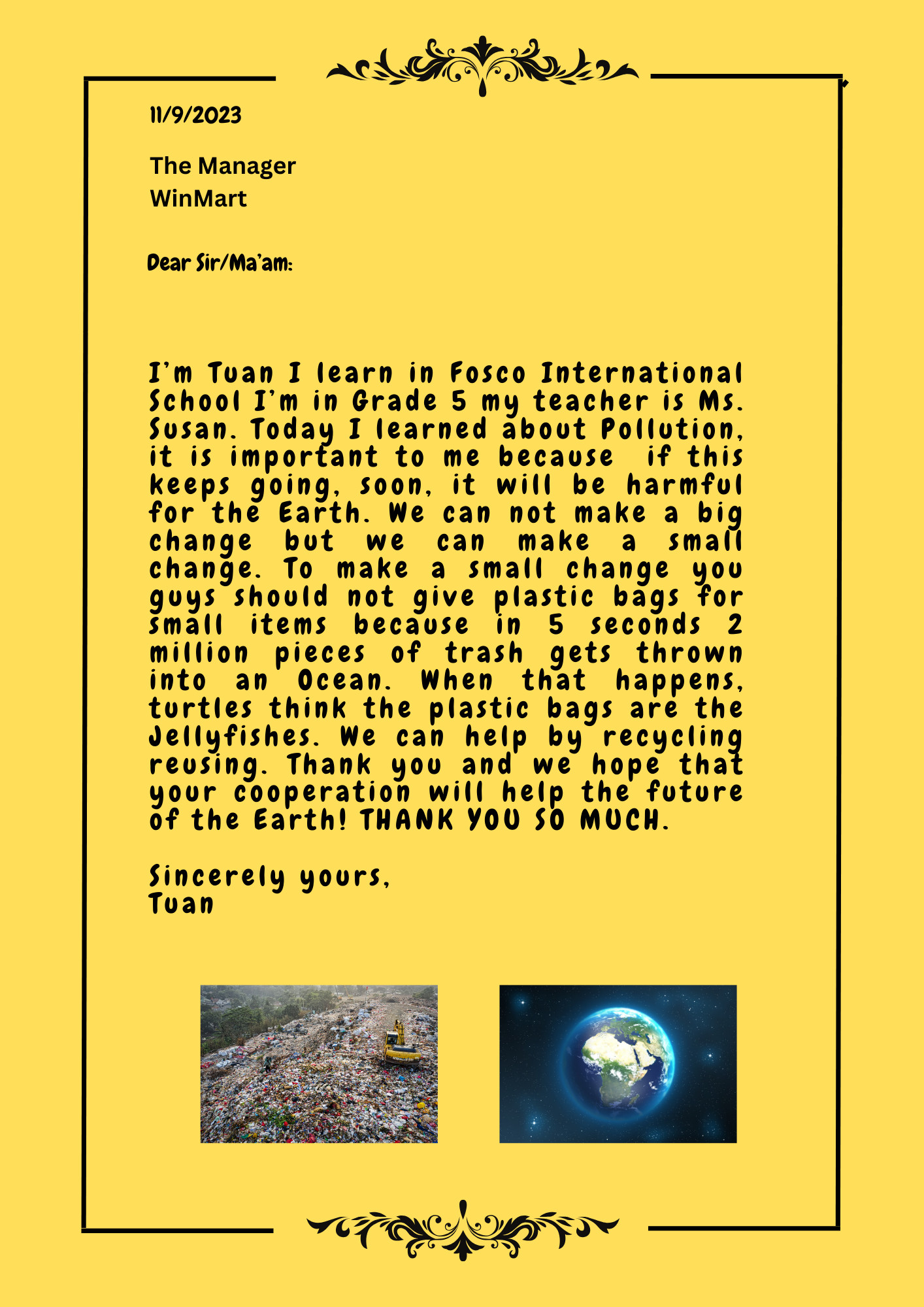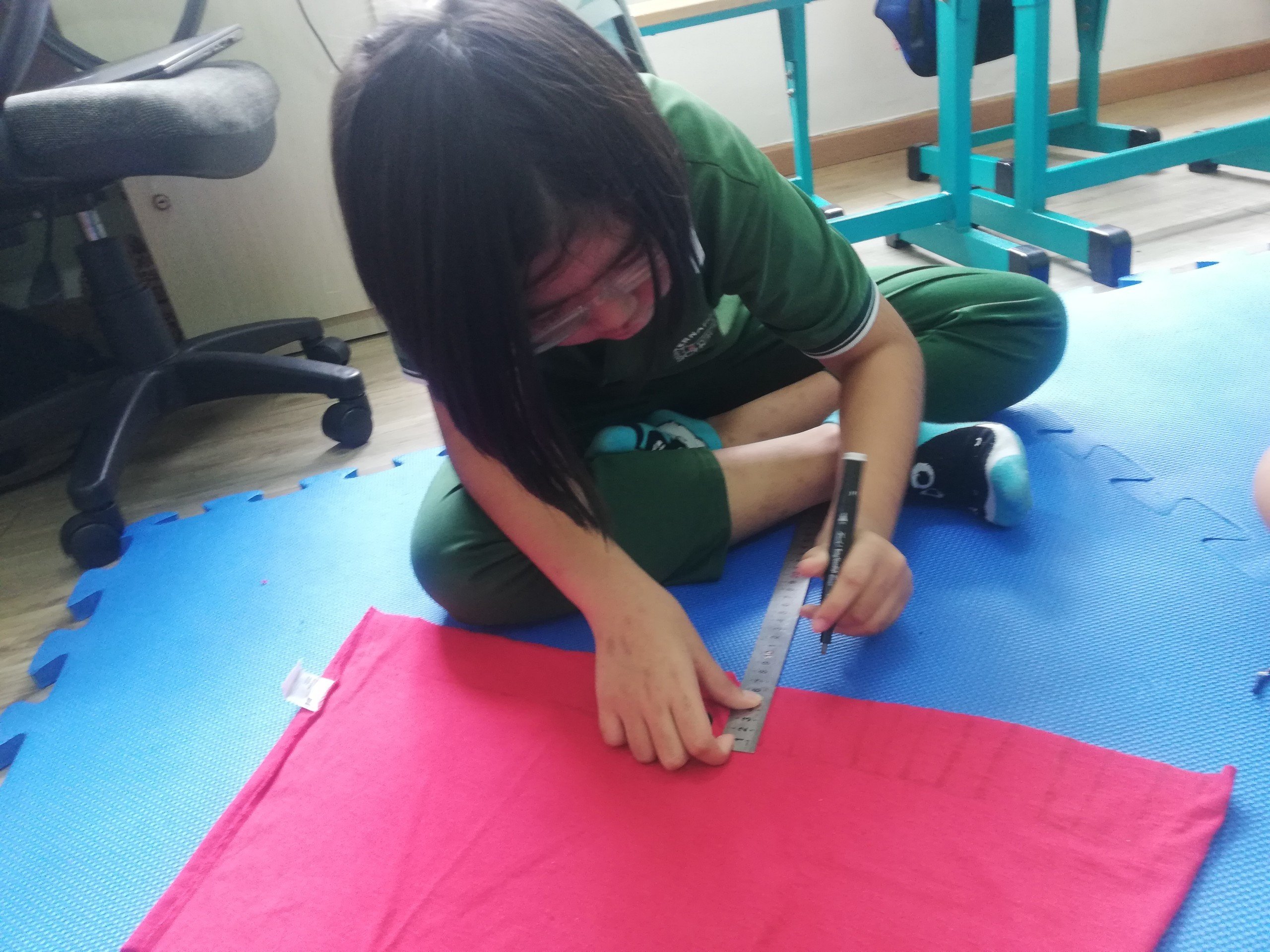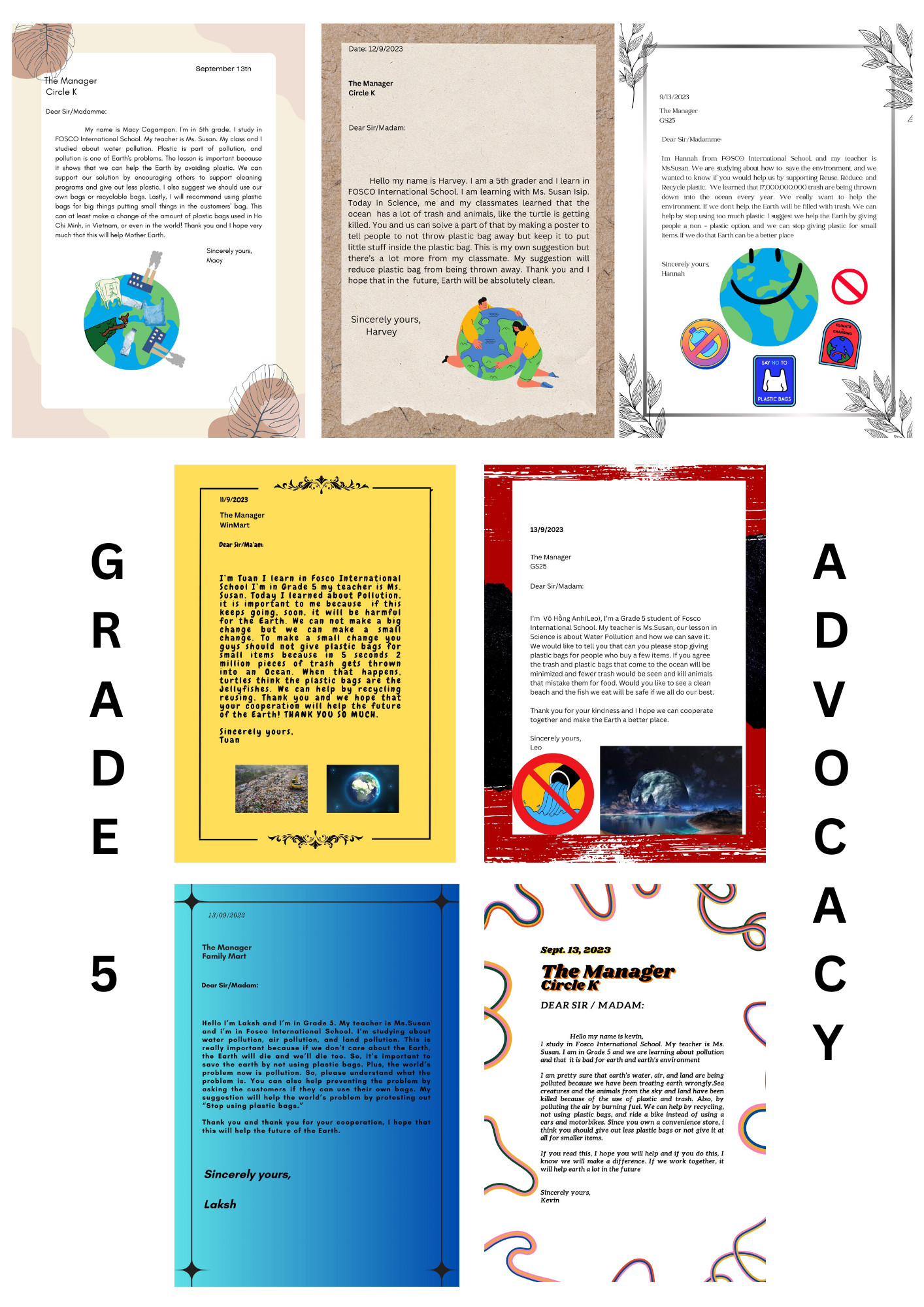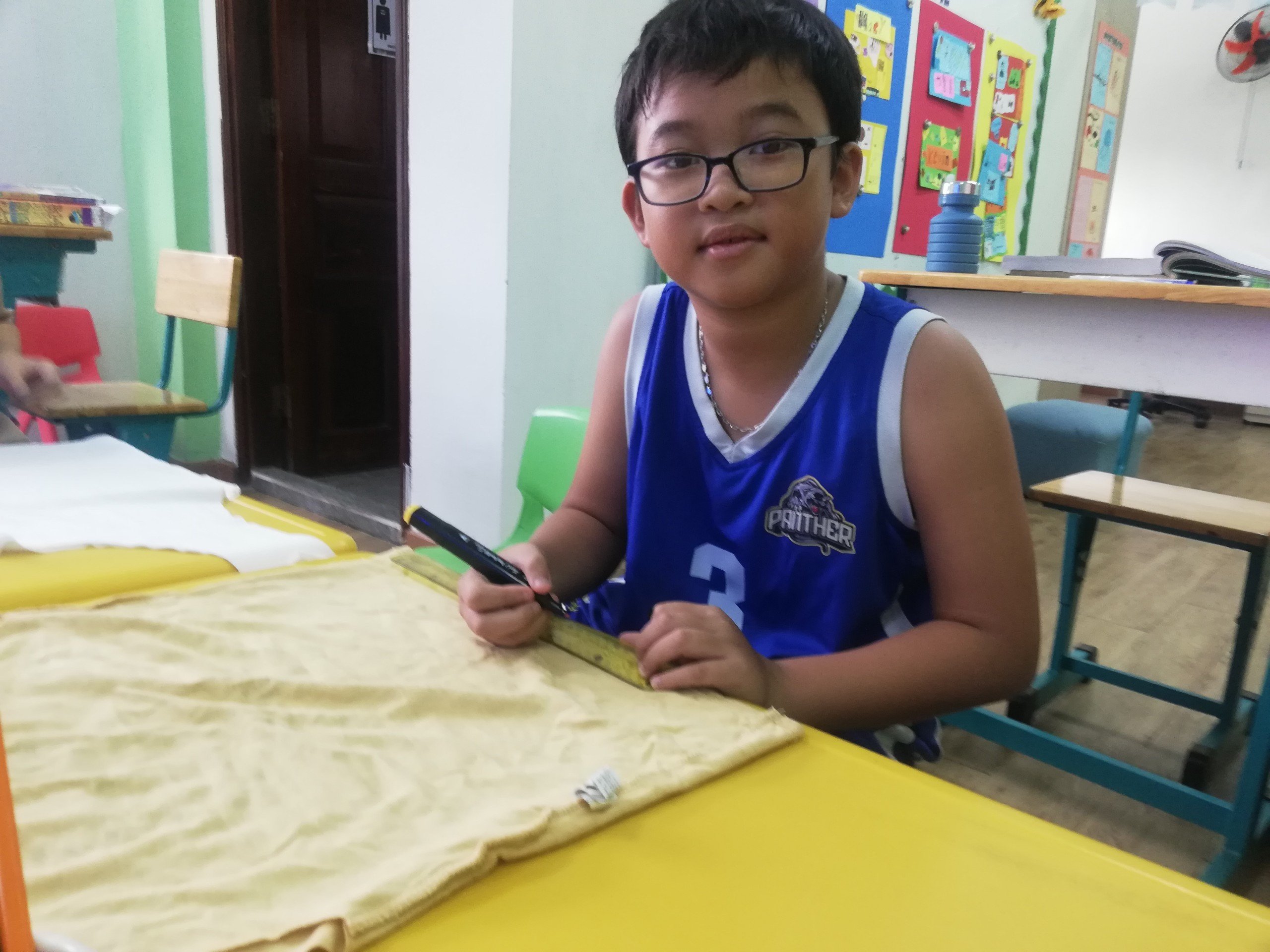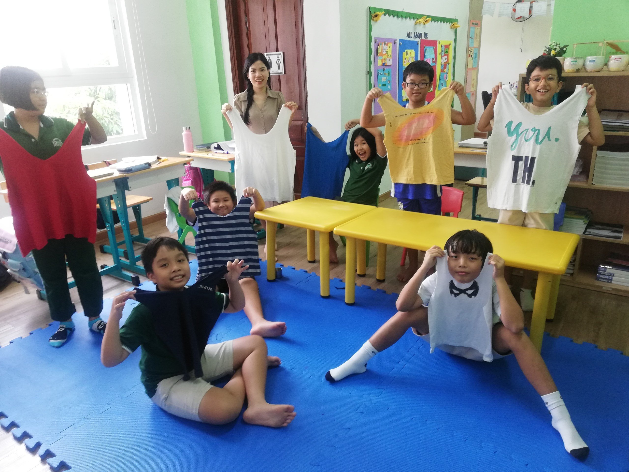 Trong môn Khoa học, Học sinh Lớp 5 đang tìm hiểu về việc con người tác động và thay đổi hệ sinh thái như thế nào. Chúng tôi nhận ra rằng nhiều hoạt động của con người đã và đang gây hại cho môi trường rất nhiều như sử dụng quá nhiều nhựa. Ví dụ, một món đồ nhỏ mua ở cửa hàng tiện lợi, và chúng được đựng trong túi nhựa. Mọi người cũng nên có trách nhiệm sử dụng những chiếc túi có thể tái sử dụng như những chiếc túi tote/ túi vải mà các em đã làm trong lớp để có thể bảo vệ môi trường khỏi những tác động của việc sử dụng quá nhiều đồ nhựa. Các em học sinh lớp 5 làm túi tote bằng cách tái chế áo phông cũ. Các em muốn gửi thông điệp tới mọi người rằng có thể sử dụng túi tote cá nhân, tái sử dụng khi đến các cửa hàng tiện lợi. Học sinh cũng viết thư cho người quản lý các cửa hàng tiện lợi không nên phát ra quá nhiều đồ nhựa. Giáo dục lại người dân về việc không sử dụng nhựa hoặc sử dụng túi tote có thể tái sử dụng thì sẽ giúp ích rất nhiều trong việc bảo vệ môi trường của chúng ta. Đó là một dự án thú vị, hấp dẫn mà các em học sinh rất đam mê. Học sinh đã học cách may vá bằng máy khâu. Những chiếc túi tote khác được làm theo phong cách không đường may bằng cách buộc tua rua ở phía dưới.