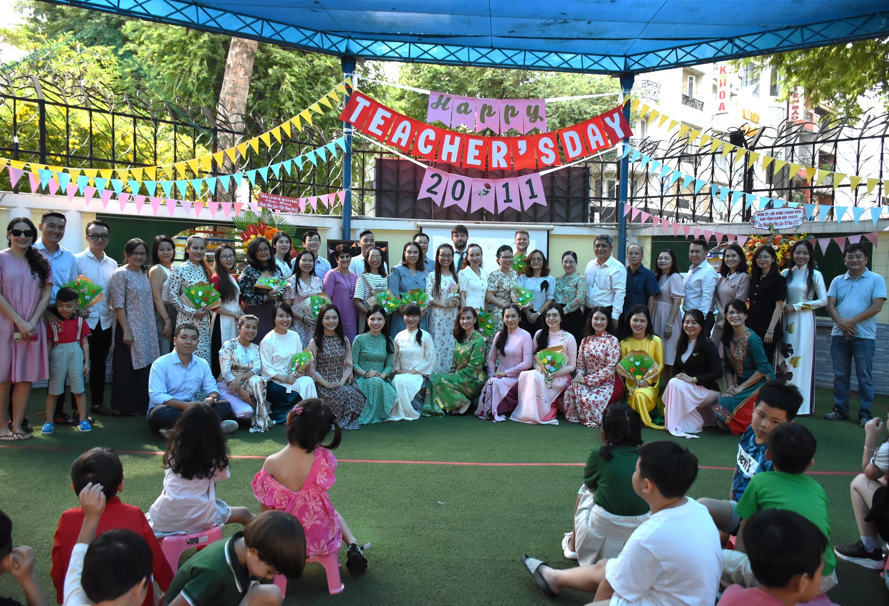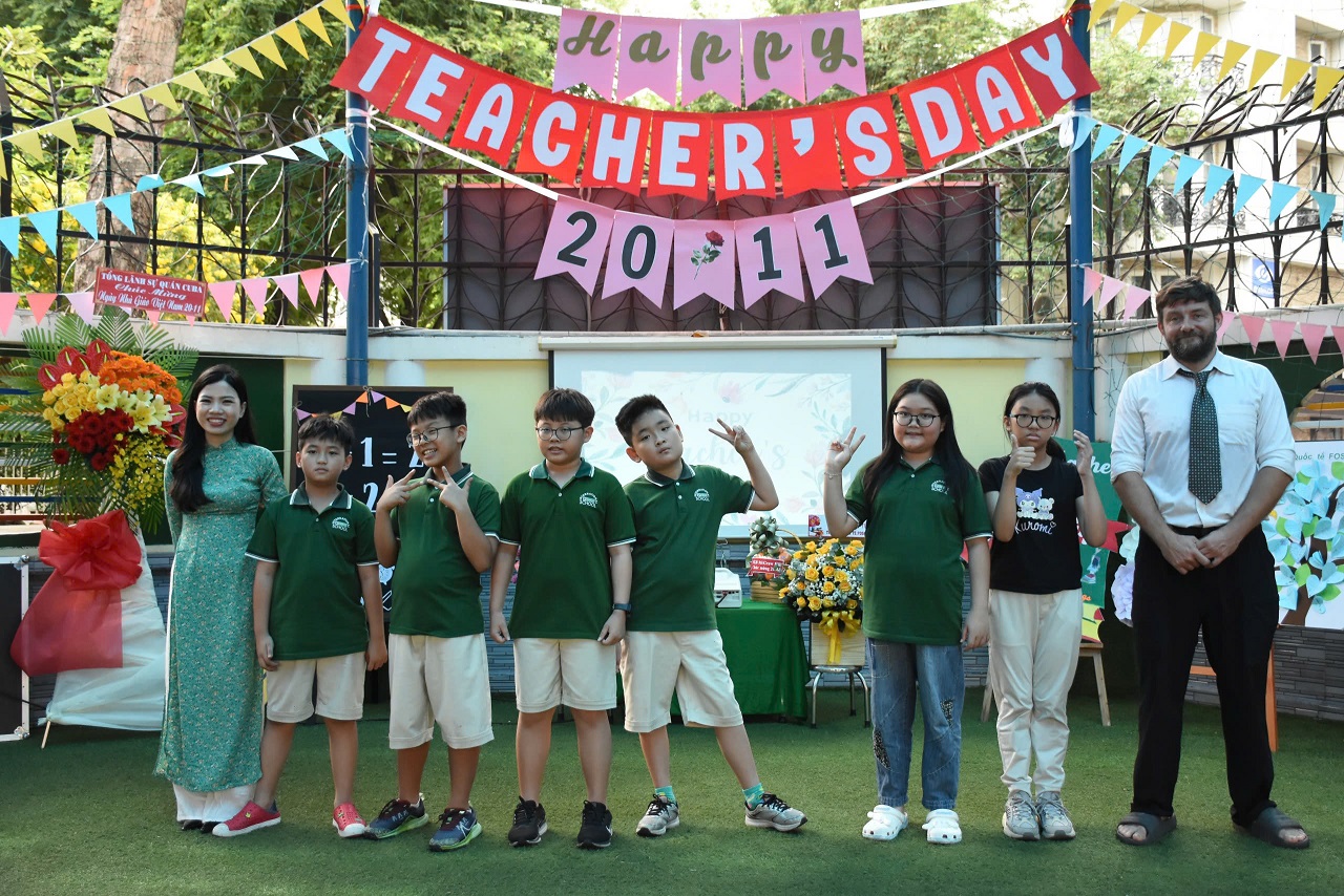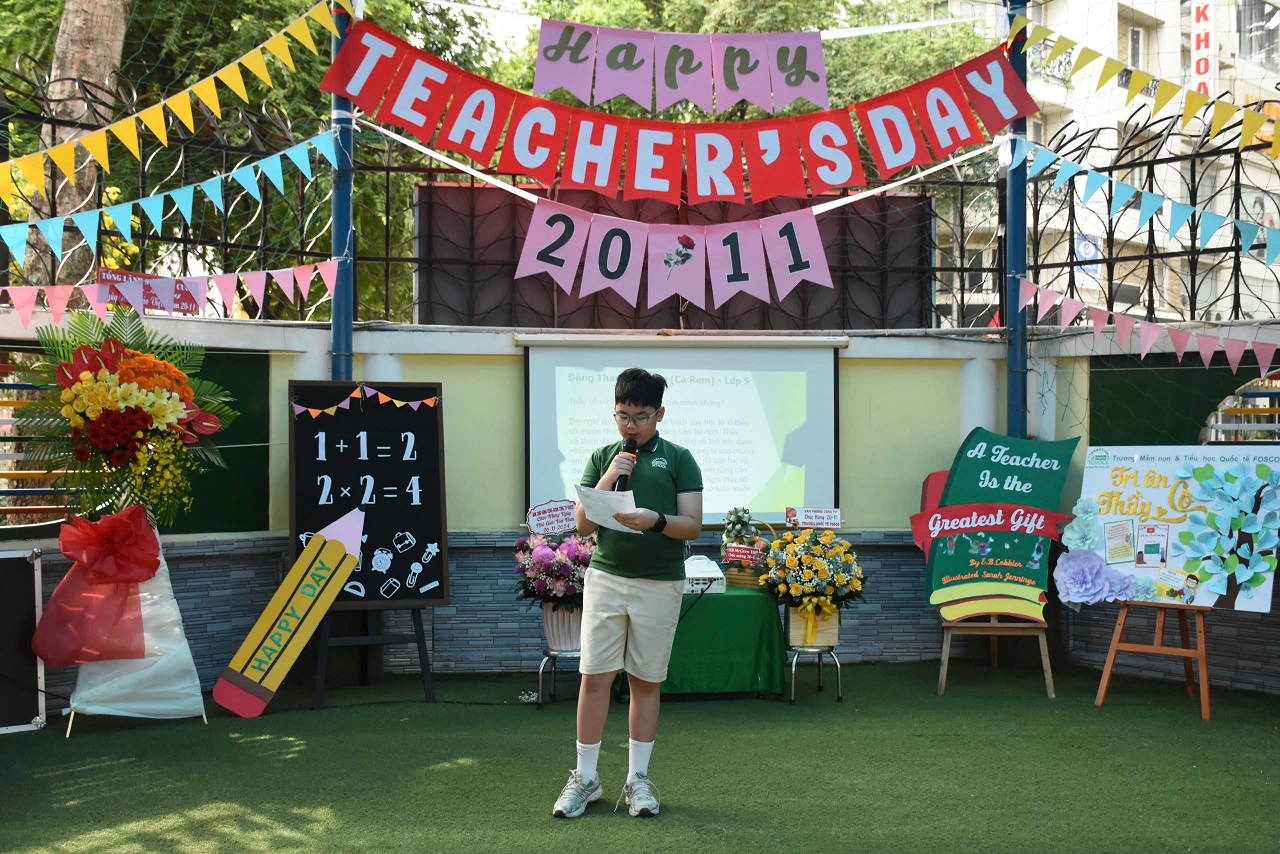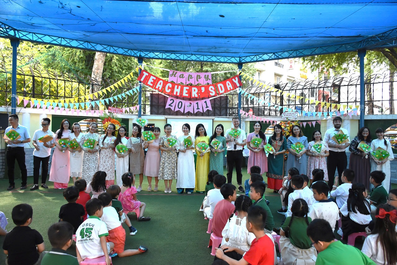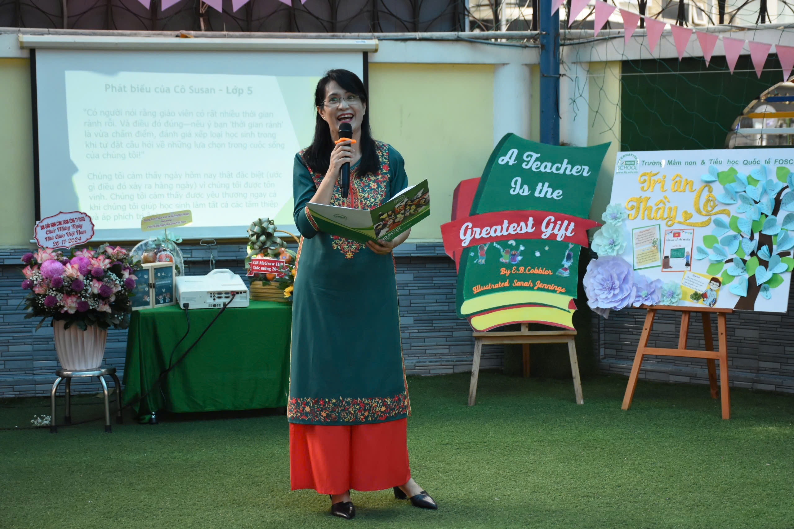 Nhà trường rất vinh hạnh khi được đón tiếp đoàn đại biểu đến từ Ban lãnh đạo Công ty TNHH MTV Dịch vụ Cơ quan Nước ngoài (FOSCO), trưởng đoàn, bà Nguyễn Thị Hương Giang – Tổng Giám đốc, bà Lê Kim Tuyền – Thành viên Hội đồng Thành viên, ông Hồ Trọng Trí – Phó Tổng Giám đốc, ông Nguyễn Nam Thắng – Kiểm soát viên, Đại diện từ các đơn vị trực thuộc, Tổng lãnh sự Cuba, các đối tác, nhà cung cấp đã gửi những lời chúc, hoa và quà tặng tri ân đến Trường Quốc tế FOSCO nhân dịp này. Buổi lễ trở nên đặc biệt hơn với những bài hát và điệu nhảy đáng yêu của các em học sinh Mầm non, Mẫu giáo và Tiểu học cho đến những tấm thiệp, áp phích và bó hoa thủ công do học sinh tự làm tuyệt đẹp. Mỗi khoảnh khắc đều là sự thể hiện tình yêu thương dành cho quý thầy cô của chúng tôi!
